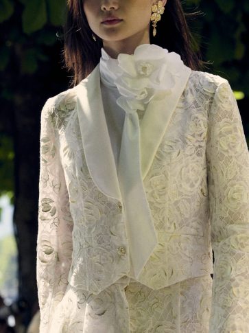 Очарование сада Villa d’Este воплощается в кружевных деталях: магнолии, глицинии, камелии, рододендроны и олеандры превращаются в утончённые узоры. Цветочные мотивы рассыпаны по костюмам, юбкам и жакетам, придавая им живописную изысканность.