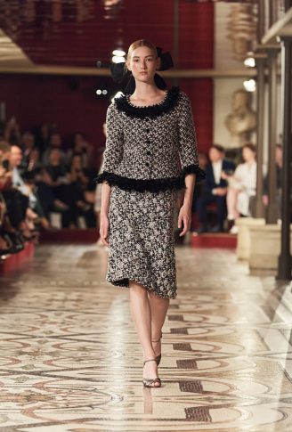Средь множества ансамблей выделяются костюм CHANEL с бокс-плиссе в бордовом твиде с белой атласной отделкой, черный вельветовый смокинг и белая блузка с вышитым жабо, черный костюм с длинными кюлотами и коротким приталенным жакетом, декорированным черными перьями. Все эти наряды гармонично сочетаются с длинными пальто, объемными накидками и вечерними платьями, напоминая о модернизированных сценических традициях и искусстве парадности.