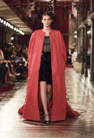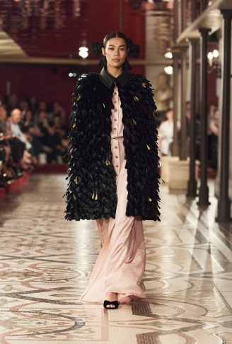 В этой коллекции мир высокой моды и оперы сливаются воедино. Перья, кисточки, кабошоны, вышитые цветы, драгоценные тесьмы, лакированный джерси, мягкие твиды, шелковистый бархат, иллюзорный тюль, тафта и сатин — эти богатые материалы создают нежный шорох. Объемы коллекции воздушны, рукава пышные, а оборки аккуратно сложены в складки. Коллекция богато украшена, добавляя романтический оттенок классическим кодам Дома.