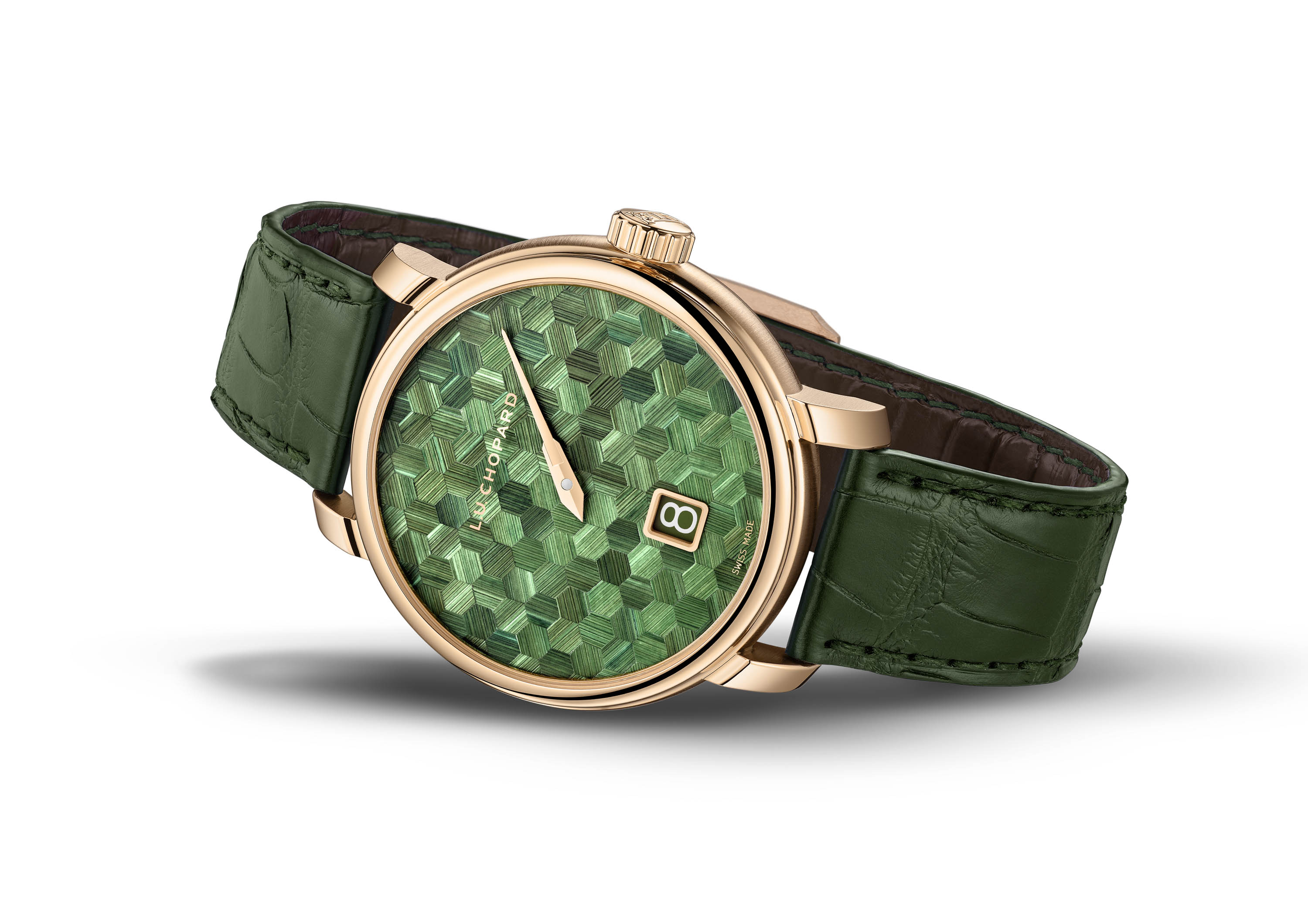 Ремешок из зеленой кожи аллигатора с коньячным кантом и застежка из желтого золота завершают образ. Ограниченная серия из 20 экземпляров подтверждает статус Chopard как новатора в гемологии.