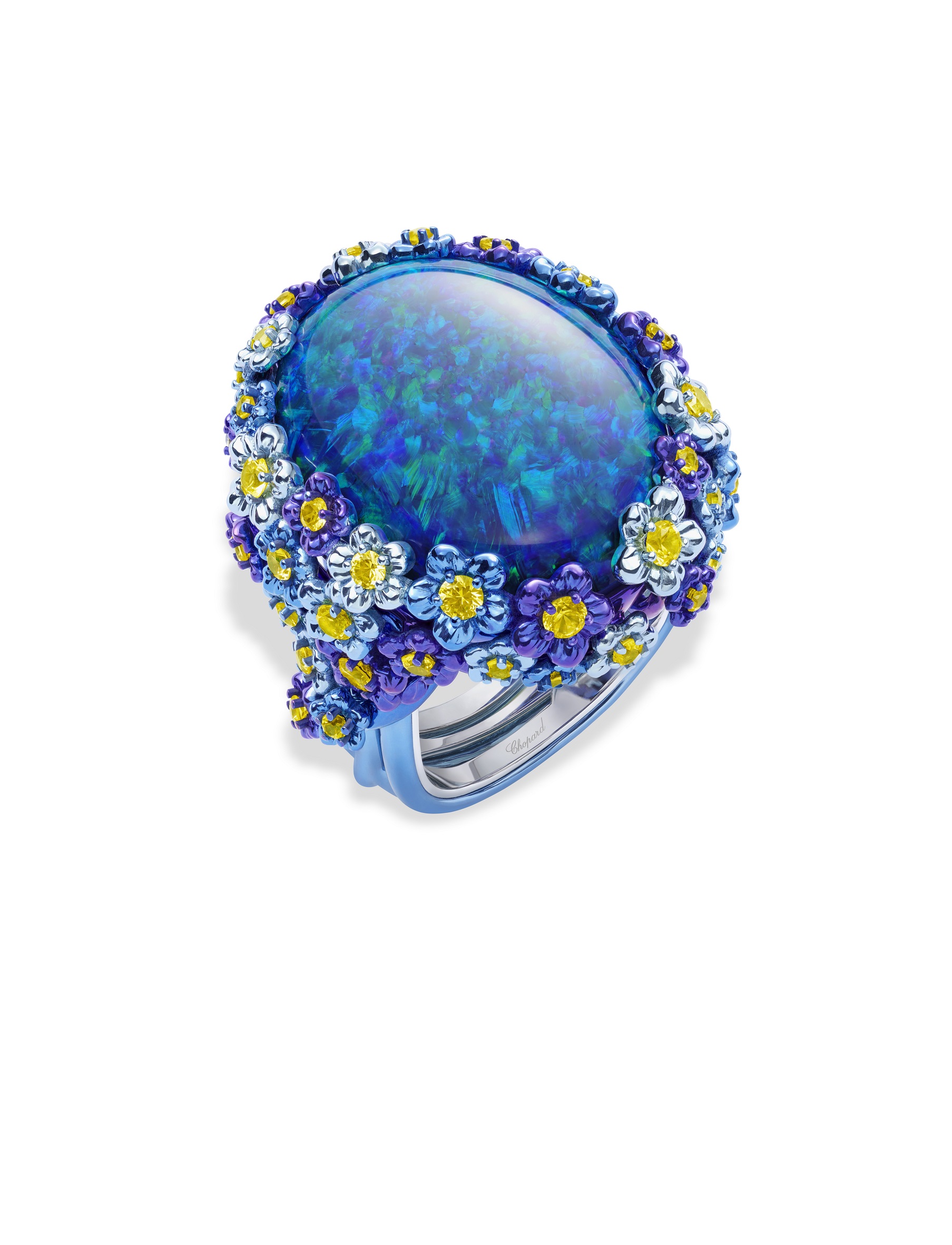 Не менее искусно выполнена подвеска в виде олененка из коричневых бриллиантов: он мирно дремлет, свернувшись в уютном зеленом гнездышке из цаворитов и бережно охраняя своим телом великолепный бриллиант сердцевидной огранки. Очаровательную серию продолжает подобное талисману кольцо с черным опалом весом 26 карат в окружении цветов из окрашенного титана и желтых сапфиров.