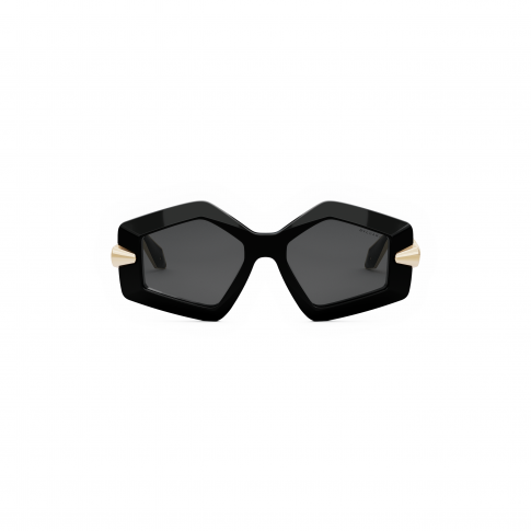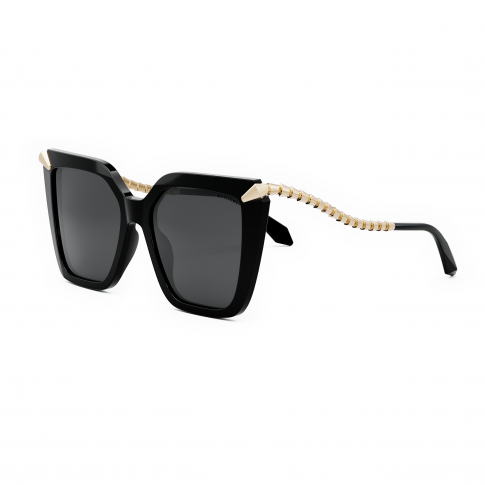 Смело-футуристические и неизменно элегантные, эти низкие прямоугольные модели украшены фирменной отделкой B.zero1 с эмалью на заушниках, перекликающейся с культовой римской эпиграфикой. Дизайн украшен гранями на кончиках, намекая на наследие римского ювелира. Современная элегантная модель выдаёт женщину, которая выбирает быть другой. Блестящая черная оправа и отделка черной эмалью, дымчатые линзы.