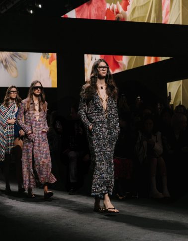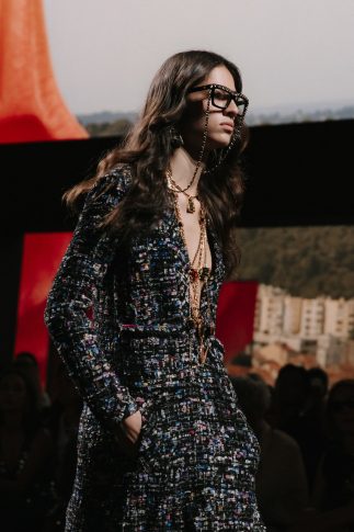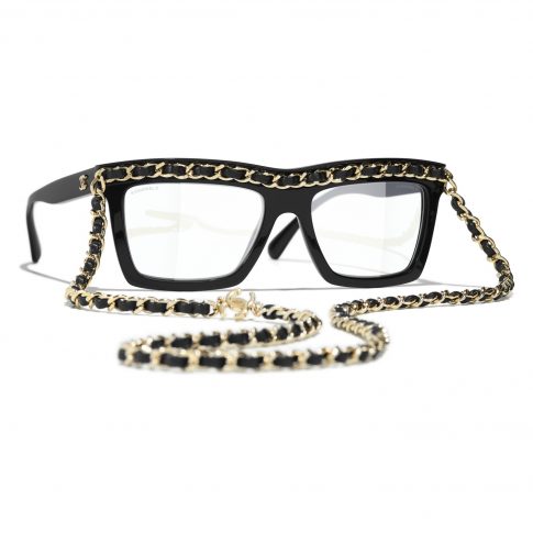 Отсыл к Мари-Лор де Ноай и Габриэль Шанель, их сильным личностям и близостью к авангарду, прослеживается в черных солнечных очках с золотыми цепями, присутствующих с самых первых луков на подиуме. Длинное платье и твидовая накидка так сочетаемы с оправами Blue Light и черными ацетатными оправами. Их прямоугольные линии подчеркиваются «эмблематичной» металлической цепью, переплетенной с кожей, которая переходит в длинное колье-сотуар. Цепь также присутствует на очках из ацетата, вдохновленных 1990-ми.