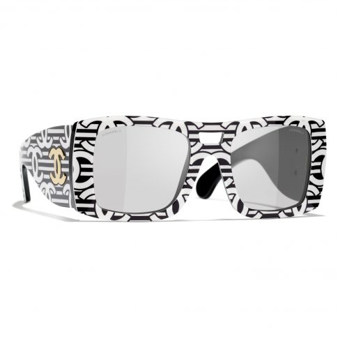 Полосатый пиджак и брюки, оживленные двойным C, вдохновили на создание квадратных солнцезащитных очков с двойным мостом из ацетата, напечатанными одним и тем же геометрическим узором. Коллекция очков CHANEL весна-лето 2024 года доступна в бутиках с марта.