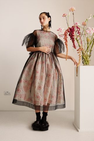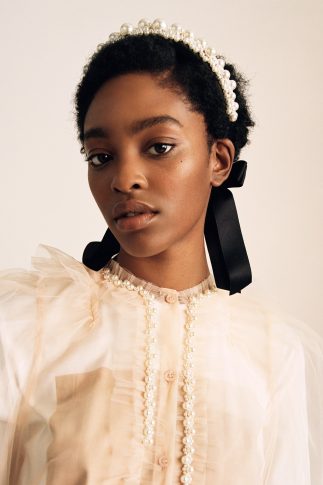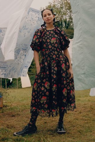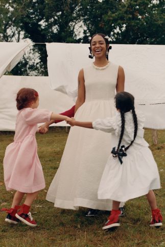 Сама коллекция — выступление в набирающем популярность жанре «переосмысленного архива»: не перевыпуск, а скорее ремейки хитов. А их за десять лет у Симон накопилось немало, и те, кто внимательно следит за ее творчеством, без труда поймут, откуда пришла та или иная деталь — пышные рукава, украшенный жемчугом ворот, вышивка. «Думаю, все это очень в духе Simone Rocha, — говорит дизайнер. — Тут и палитра, которую мы с командой обожаем: кремовый, розовый, красный. И «ссылки» на Ирландию, много для меня значащую. А еще есть вариации всех моих фирменных аксессуаров: банты, украшения с бусинами, декорированные жемчугом броги».