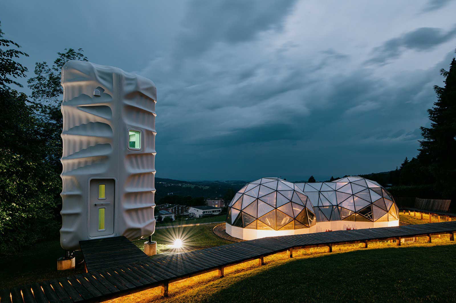 Внешняя оболочка Rosenberg Space Habitat была напечатана на широкоформатном 3D-принтере в Милане, а внутренняя структура сделана в сотрудничестве с высокотехнологичными компаниями Camozzi и Ingersol. Использование полимера в 3D-печати – революционное решение, он более универсален, чем остальные материалы, используемые при 3D-печати. Institut auf dem Rosenberg использовал УФ-стабилизатор, в результате чего получился гибкий, но прочный материал, пригодный для вторичной переработки – при необходимости его можно разрушить и перепечатать в другую структуру.
