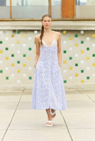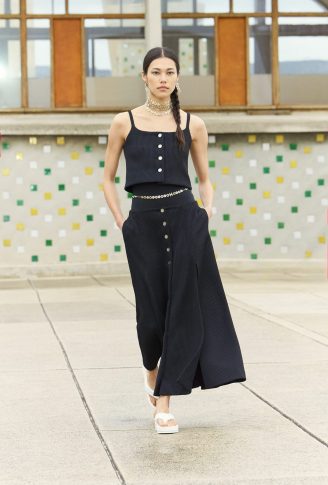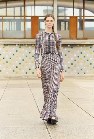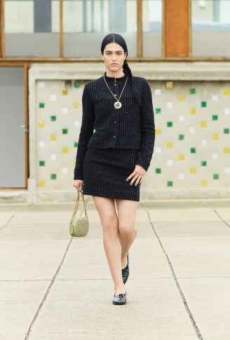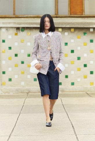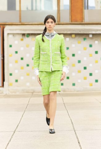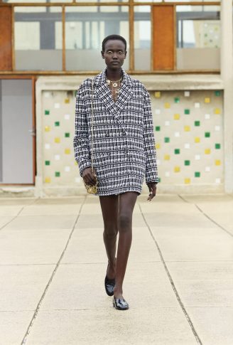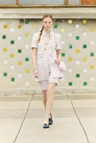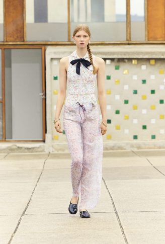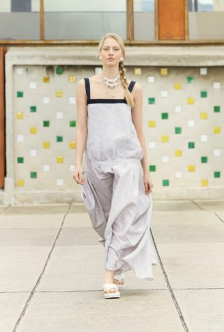 Коллекция переосмысливает классические черты толстовки, предлагая собственную версию в шифоне с рисунками. Ее кенгуру-карман появляется на клетчатом платье с капюшоном, но без рукавов. Бермуды отделаны вышитой косичкой, твидовые велосипедные шорты и объемные пиджаки завершают коллекцию, которая объединяет динамику движения. Холстеры в черно-белой гамме и черные лаковые туфли — отсыл к мужской модой. Коллекция также играет с наслоением: воротники рубашек, манжеты и пиджаки носятся поверх или под другими нарядами. Маленькое черное платье переосмысливается здесь в бюстье из джерси.
