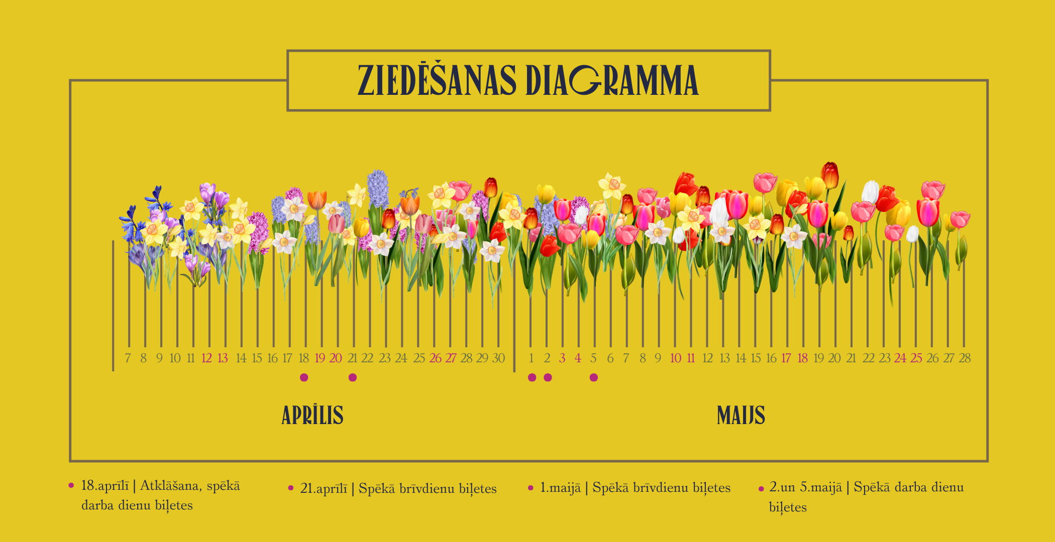 Планируя поездку в праздничные выходные, воспользуйтесь возможностью посетить фестиваль по более выгодной цене. 18 апреля, а также 2 и 5 мая, когда в Литве, в отличие от Латвии, нет выходных, действуют цены на билеты буднего дня.