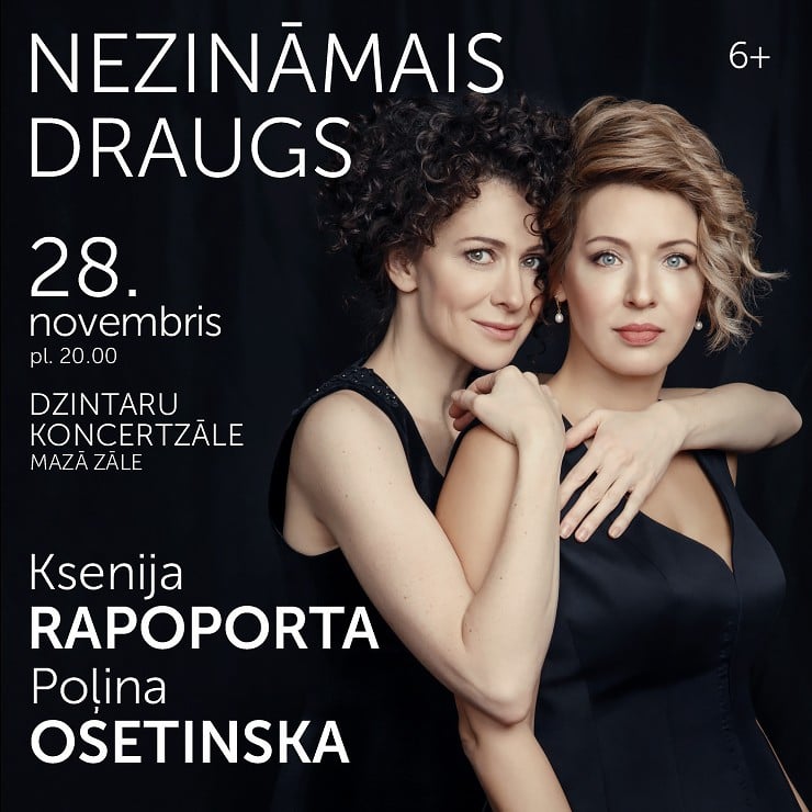 28 ноября 2025 года в 20:00 в Малом зале концертного зала «Дзинтари» состоится литературно-музыкальный спектакль «Неизвестный друг» с участием Ксении Раппопорт и Полины Осетинской.