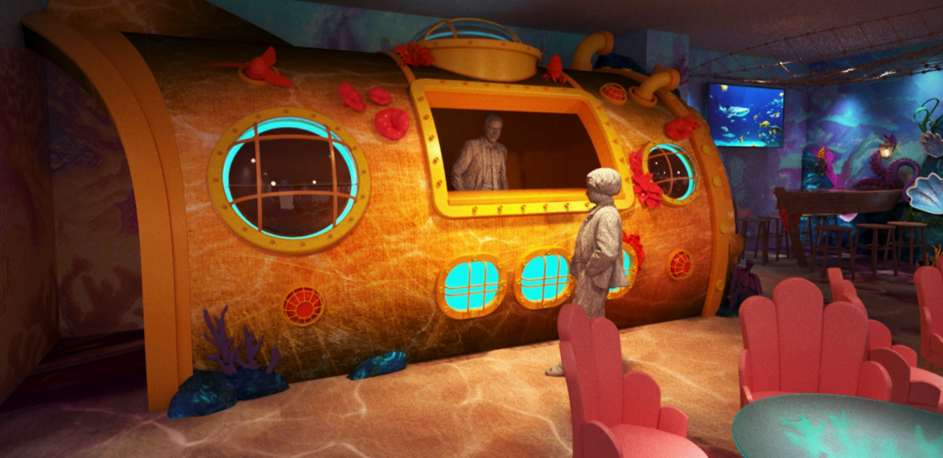 Здесь есть уникальная сцена, созданная художниками и режиссерами детского банкетного комплекса. Её образ напоминает передвижной театр бродячих артистов затерянного мира. Сцена увита всевозможными фонарями и лампами на разный лад, в разные стороны торчат трубы граммофона. Зал оснащен световым и звуковым оборудованием, видео экраном.
