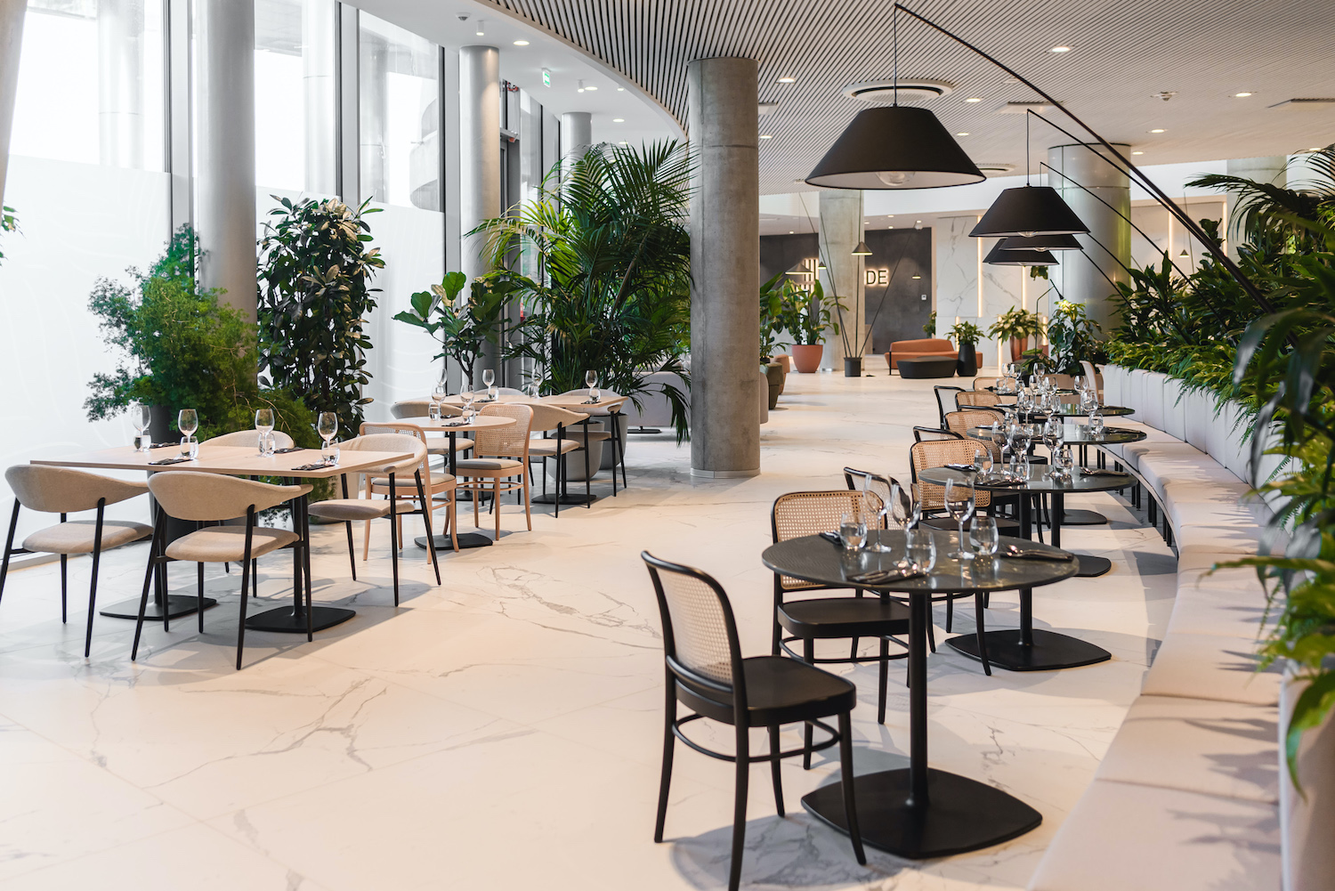 Новый обеденный ресторан площадью 537 м2 расположен на уровне лобби корпуса А “Verde”, или на нулевом этаже. Его дизайн создавался в соответствии с общим архитектурным стилем “Verde” — светлые помещения в сочетании с мебелью естественных земляных тонов и, конечно же, множеством комнатных растений, которые придают ресторану особое настроение “городских джунглей“.