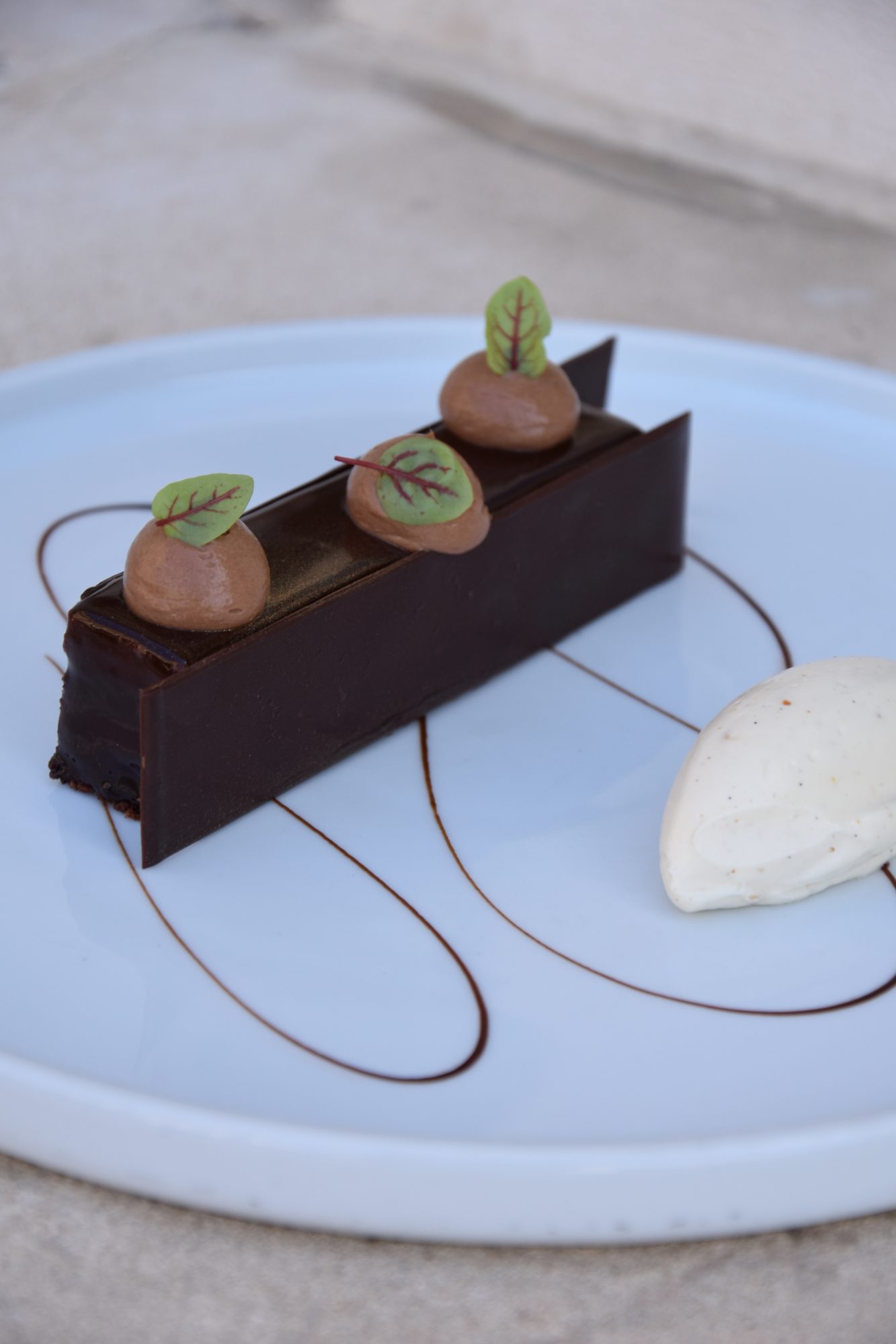 - Шоколадный десерт с бобами тонка и лакричным мороженым.