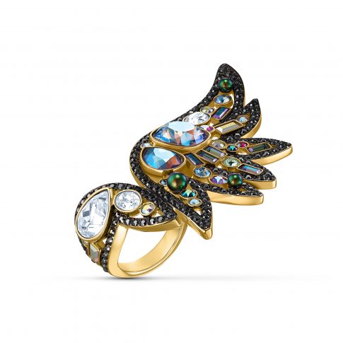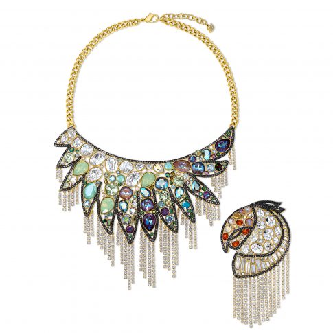 Дерзкие нео-тропические силуэты отражают дух и энергию лета. Изящный пальмовый лист, попугаи, а также тропические цветы усыпаны яркими кристаллами Swarovski c покрытием оттенка золота. В коллекции представлены: кольца, подвески, ожерелья, браслеты и серьги