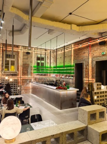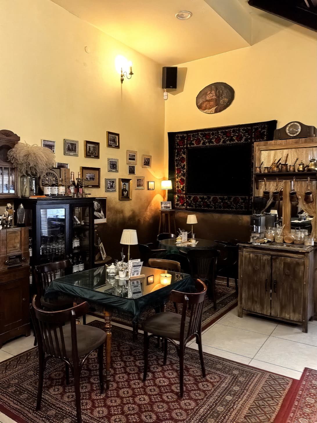 Ещё одно место, куда мы зашли, — ресторан Za kulisami. В тот вечер здесь было многолюдно: все столы заняты, шли банкеты, зал жил громко и плотно. Винная карта сразу обозначает направление — заметная подборка израильских вин выглядит здесь не экзотикой, а естественным продолжением выбранной культурной линии. Кухня работает уверенно и в условиях полной посадки, без сбоев в подаче. Za kulisami воспринимается как место, где гастрономия связана не с эффектами, а с контекстом — историческим и городским.