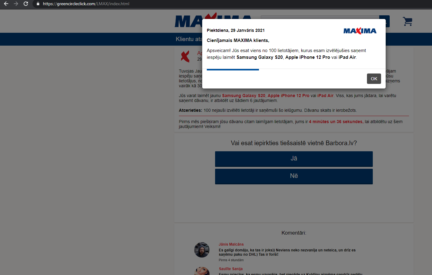 “Maxima Latvija” уже соответствующим образом отреагировала и направила запрос о блокировке мошеннического контента, а также планирует обратиться в учреждение по предотвращению инцидентов в сфере безопасности информационных технологий CERT.