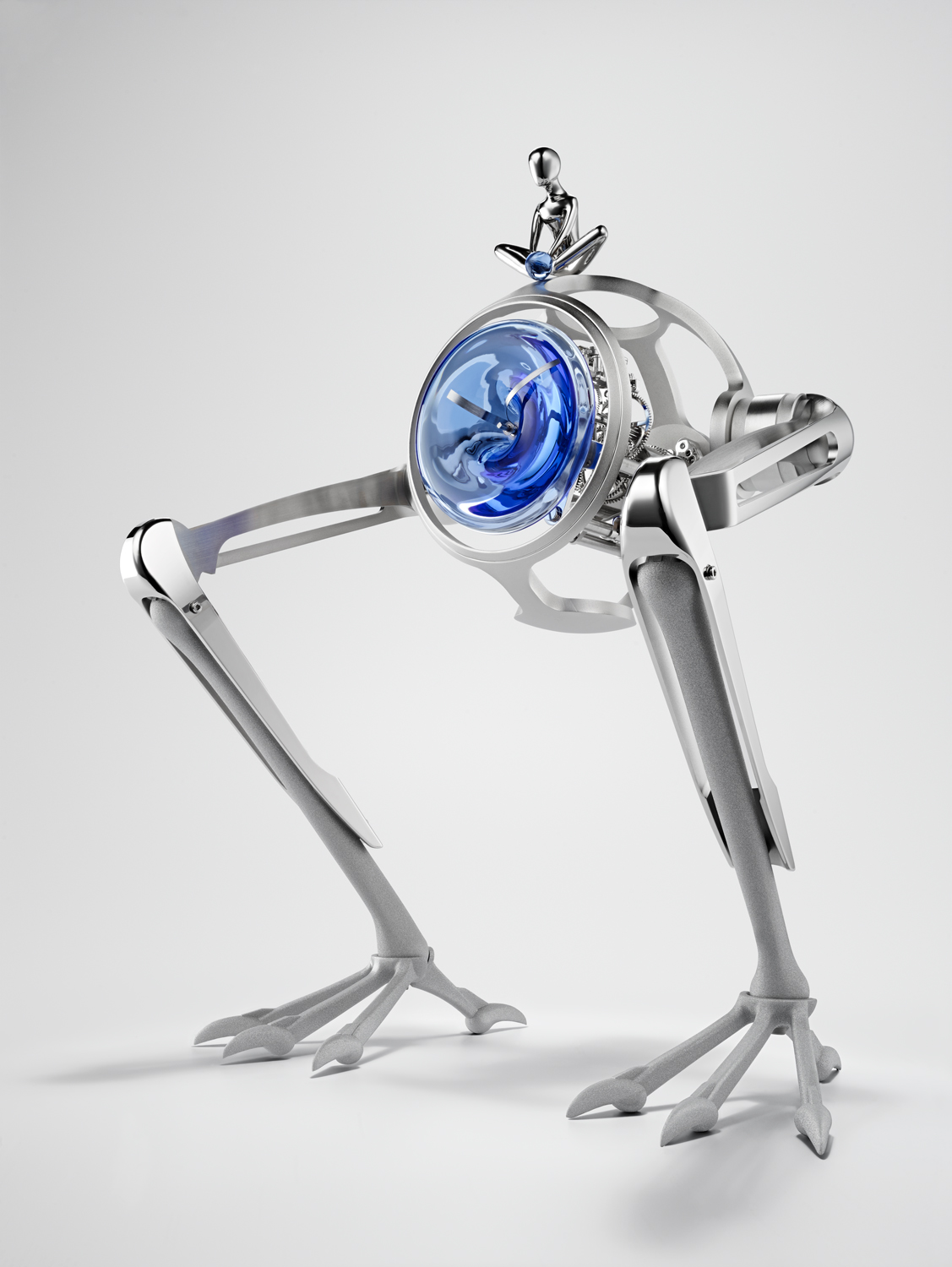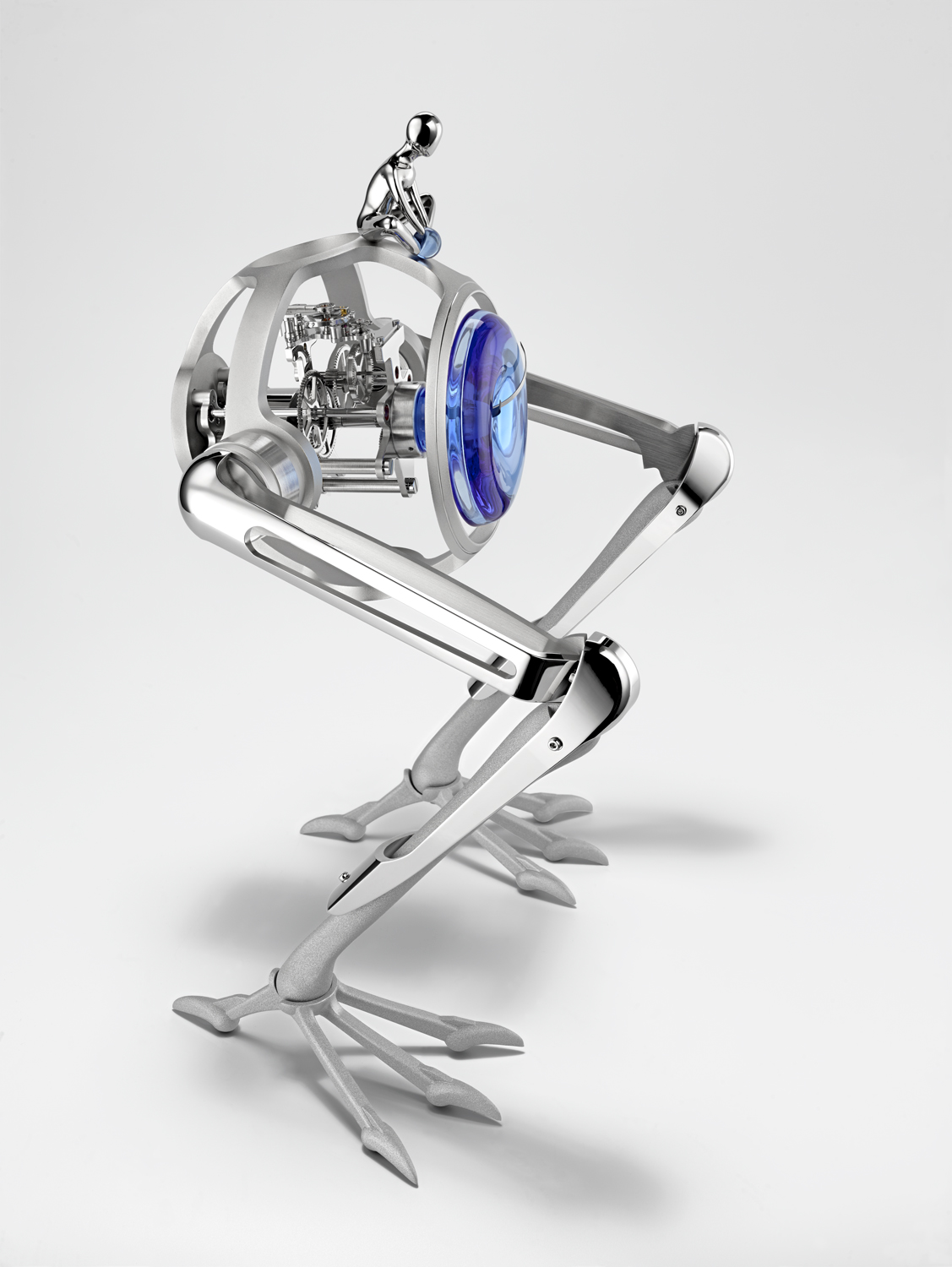 Что отличает часы Tom & T-Rex от моделей, которые появятся позже? На спину доисторического ящера помещена фигурка сидящего ребенка: этот возница, которому MB&F и L’Epée решили дать имя Том, одновременно и товарищ тираннозавра, и его подопечный.