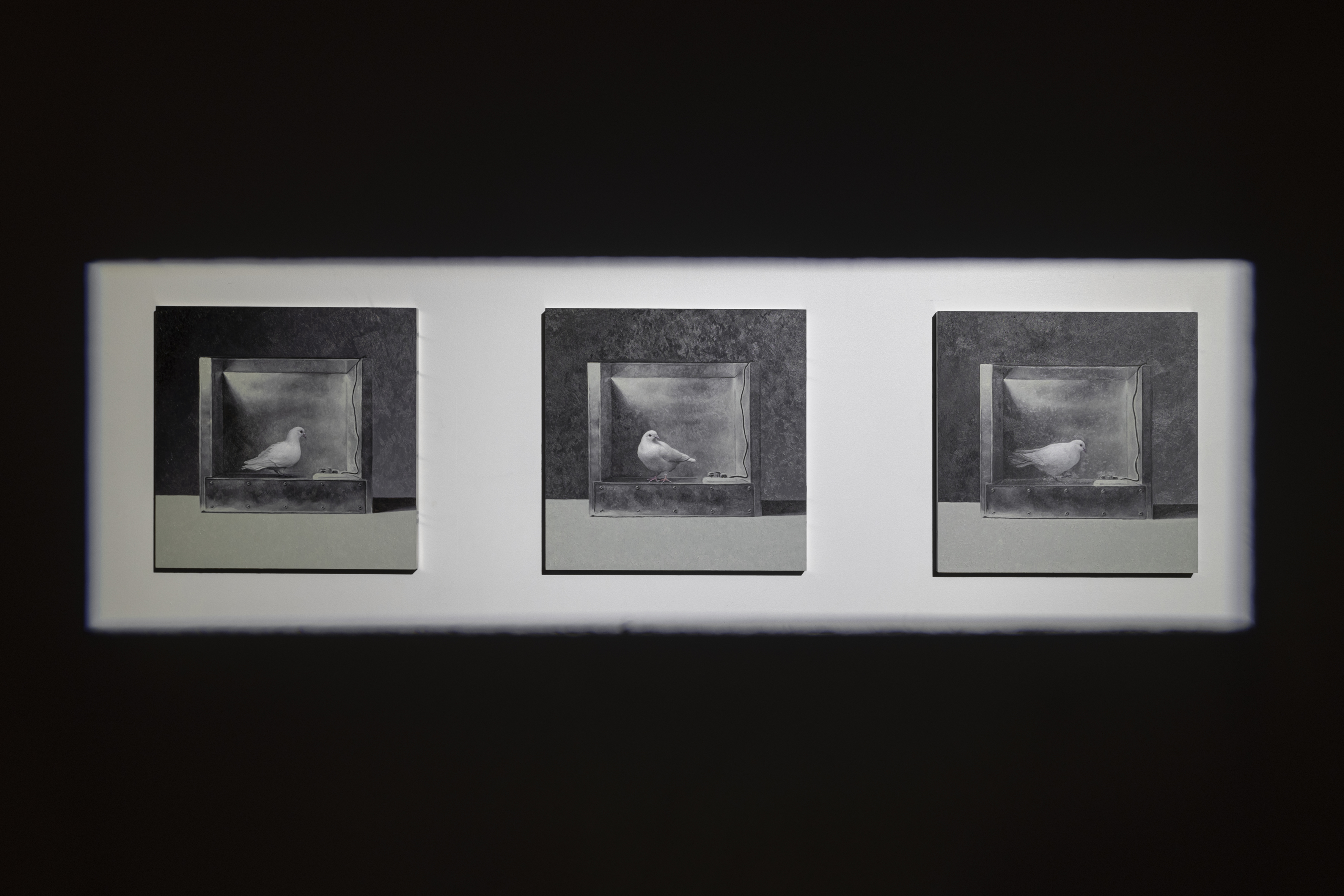 Живописная серия The Operant Conditioning Chamber, 2022 основана на фотографиях ранних экспериментов американского психолога Берреса Фредерика Скиннера с почтовыми голубями. Ящик Скиннера – знаменитое изобретение для фиксации поведенческой реакции. «Используя пищу, рычаги и другие факторы, Скиннер продемонстрировал, что то, что считалось независимым откликом, на самом деле является условным рефлексом, и тем самым поставил под вопрос казавшееся незыблемым понятие свободы воли», – Лорин Слейтер.