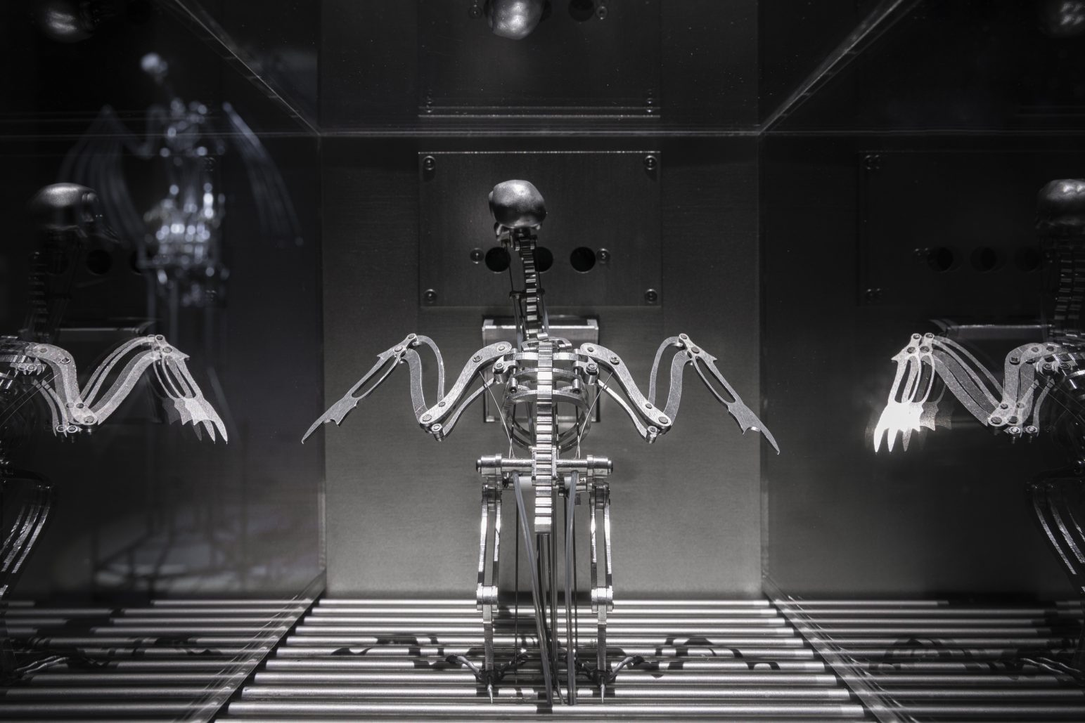 Работа The Centrifugal Soul, 2016 была создана в сотрудничестве с известным эволюционным психологом Джеффри Миллером. Масштабный зоотроп – изящная конструкция, изобретенная еще во времена Викторианской эпохи, отсылки к которой непременно появляются в работах Коллишоу. В центре зоотропа помещена платформа с закреплёнными на ней фигурами цветов и птиц. Вращаясь со скоростью 60 оборотов в минуту, платформа ежесекундно освещается вспышками стробоскопического света. Ритуал ухаживания – особое поведение птиц, обусловленное врожденным инстинктом продолжения рода. Изучение этого феномена легло в основу маркетинговых программ и принципа действия социальных сетей. Искажая реальность фильтрами и вымышленными историями, пользователь демонстрирует идеализированную версию себя в борьбе за популярность и успех в обществе.