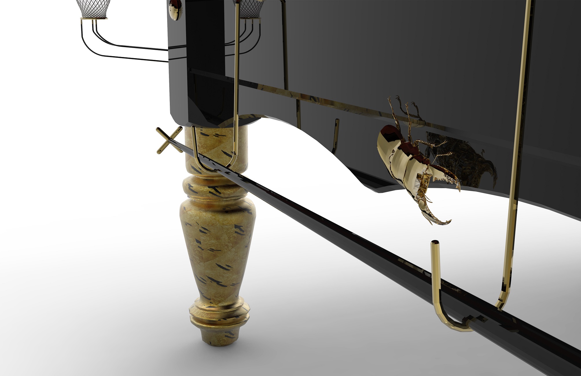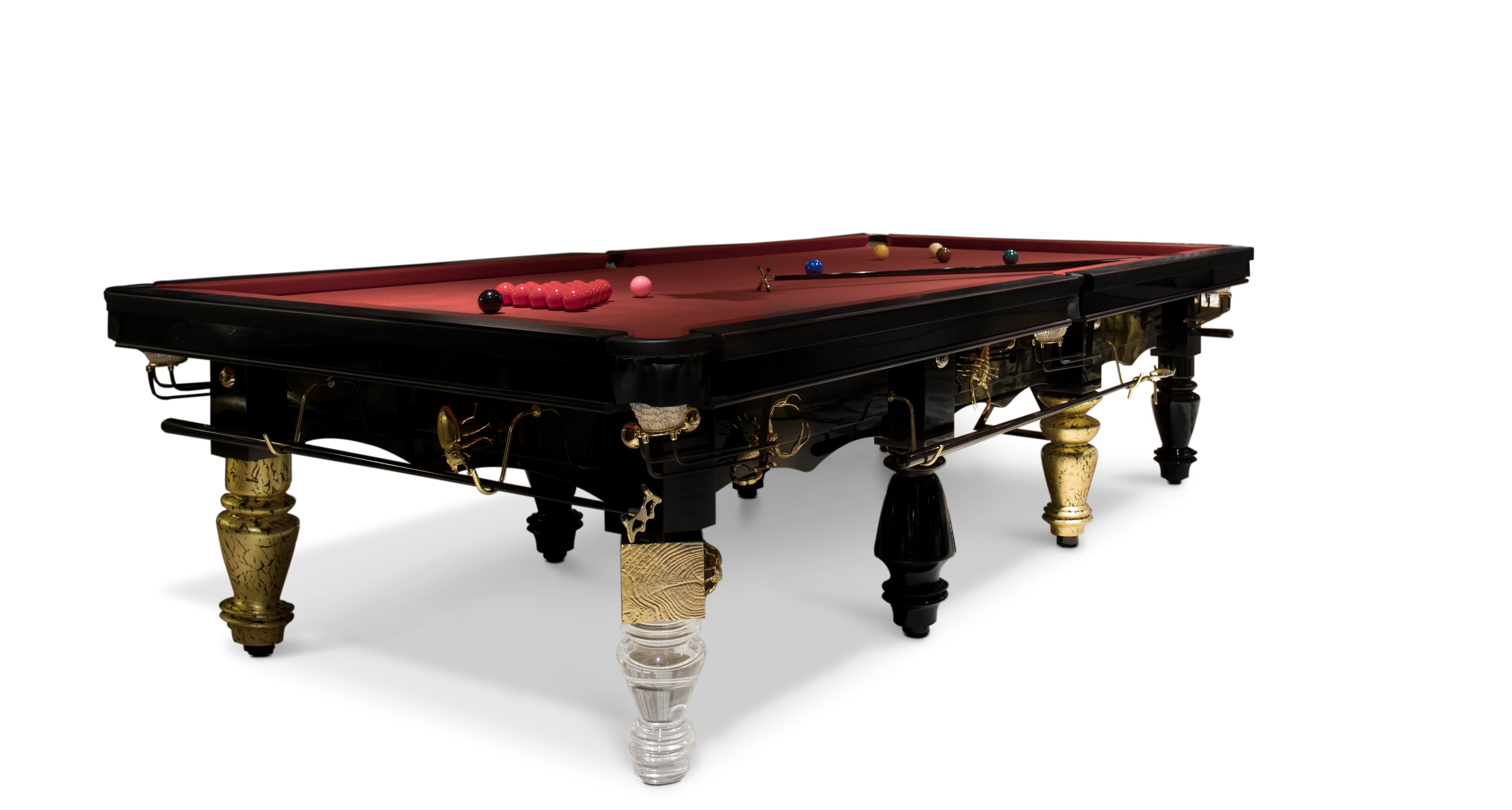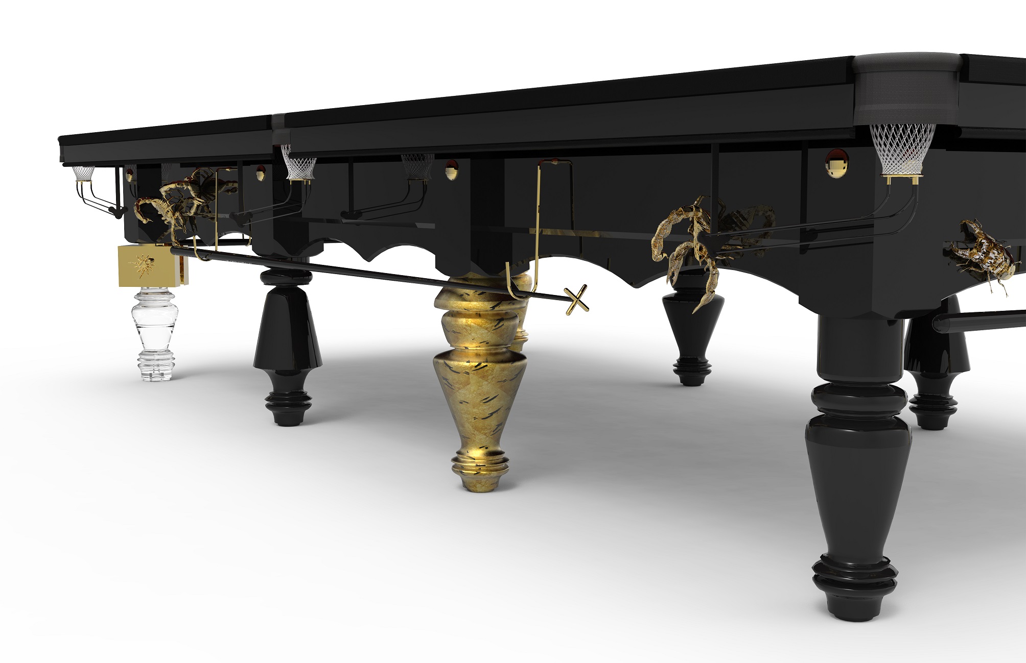 Деревянный 10-футовый стол опирается на восемь черных ножек вычурных форм. По бокам стол украшают фигуры жуков из латуни и золотых скорпионов, добавляющих особый азарт этой элитарной игре. Углы изготовлены из алюминия, а сами лузы обшиты кожей.