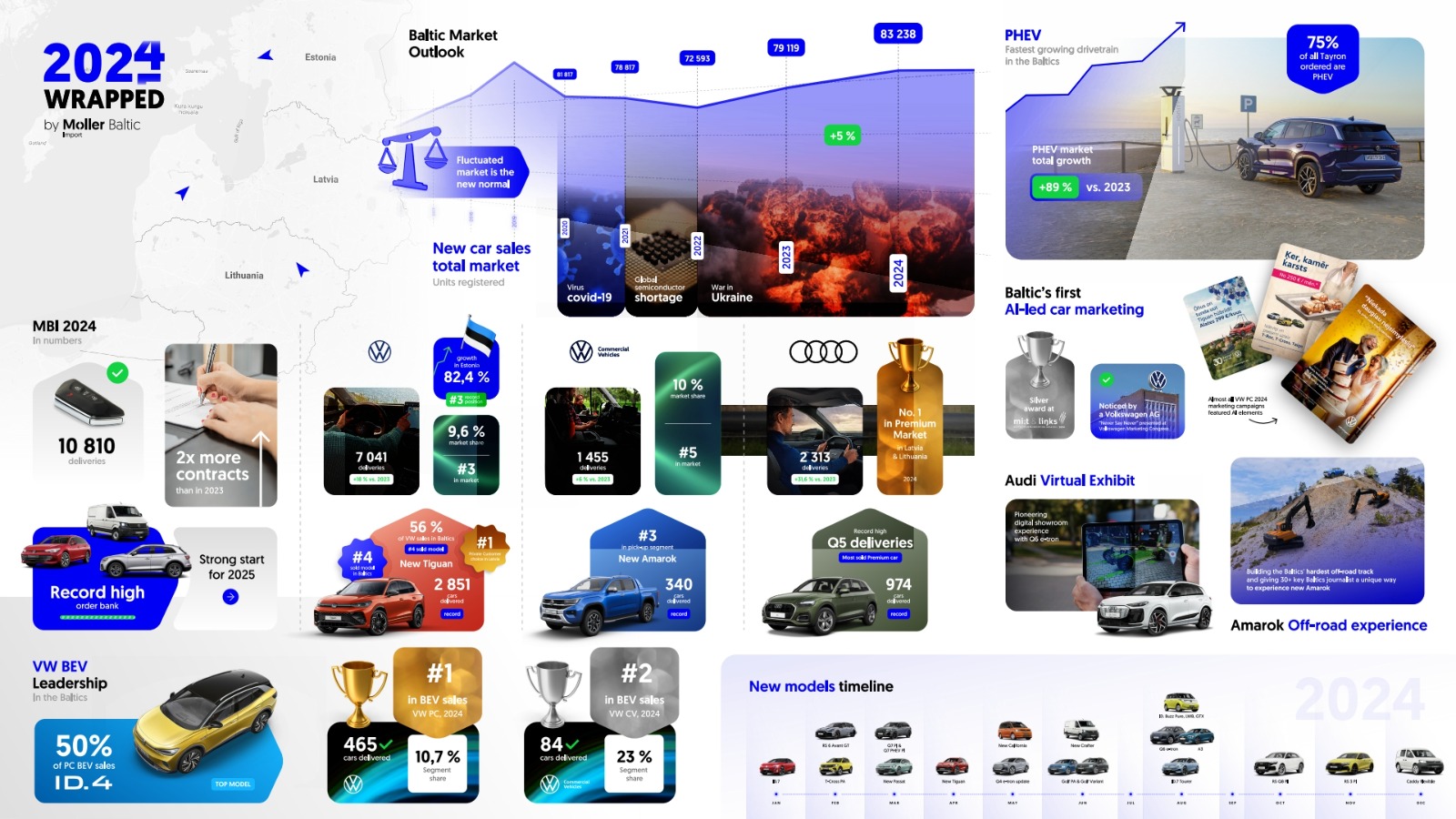 Volkswagen сохранил лидерство в сегменте электромобилей, поставив клиентам 465 электромобилей, из которых более половины составили модели ID.4. Успешными стали продажи новых ID.7 и ID.7 Tourer (17% от общего объема). Всего в Балтии было продано более 7000 автомобилей Volkswagen, что на 18% больше, чем годом ранее. В Латвии было поставлено 1941 автомобиль (+5,5%), обеспечив 11,3% доли рынка.