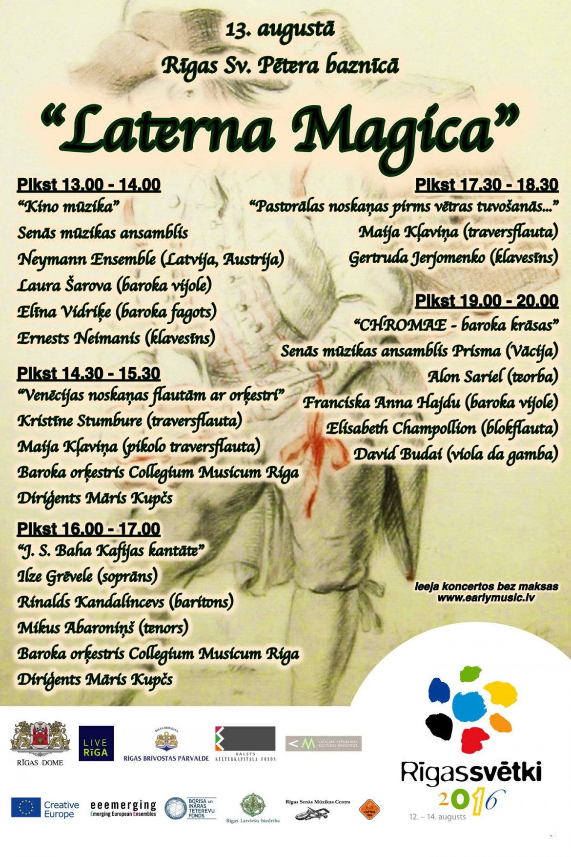 - 23 августа в 20:00 в Рижской церкви Святой Марии Магдалины можно будет услышать барочный хор «Collegium Choro Musici Riga» и барочный оркестр «Collegium Musicum Riga», под управлением дирижера Мариса Купчиса;