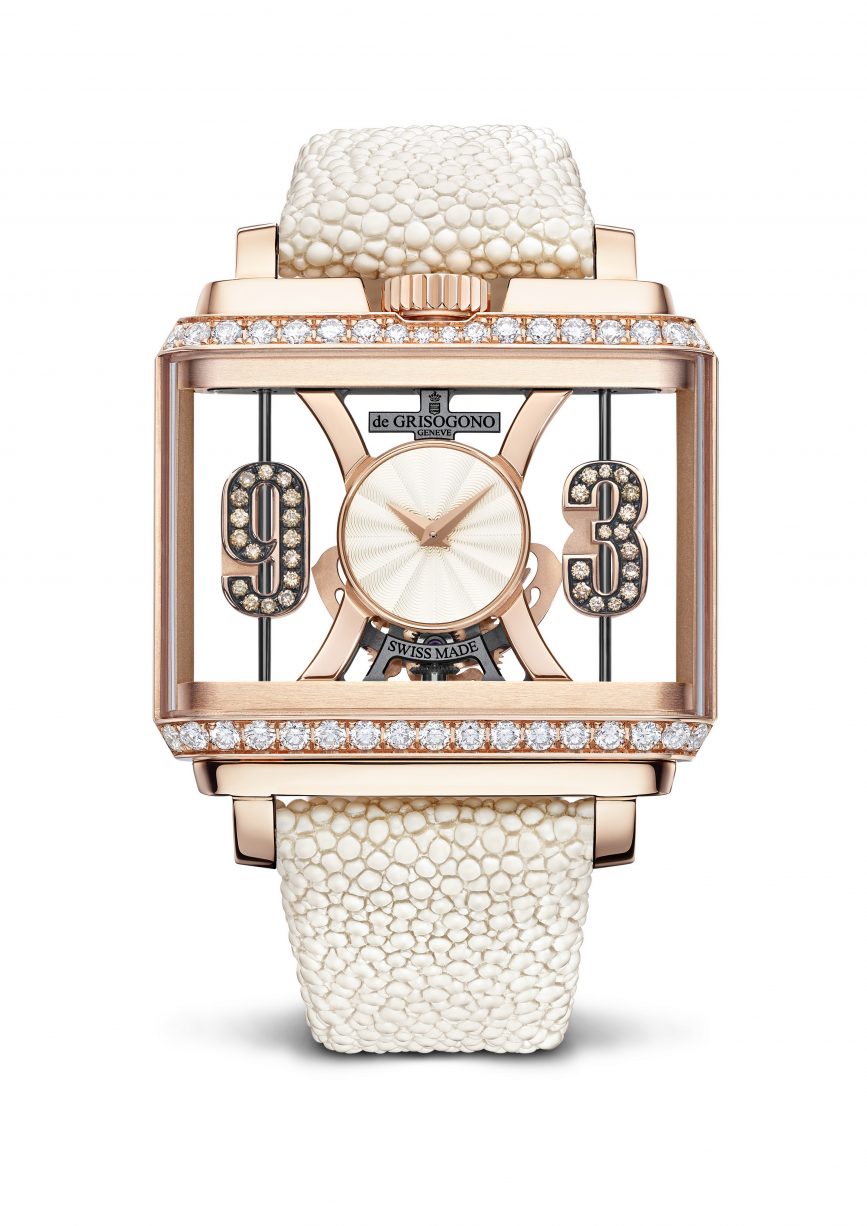 С каждым движением запястья, когда ротор совершает поворот вокруг своей оси, циферблат внезапно оживает. Стилизованные арабские цифры 3 и 9, расположенные по обеим сторонам круглого циферблата и украшенные 62 бриллиантами, начинают вращаться, показывая стороны разных цветов: у модели из розового золота цифры покрыты с одной стороны коричневыми, а с другой стороны белыми бриллиантами, а у модели из белого золота бриллианты черные с одной стороны и белые – с другой. Возникающая анимация вызывает инстинктивную улыбку, напоминая об игривом духе Дома de GRISOGONO, умеющего с присущей ему свободой и озорством найти во всем забавную сторону, но при этом не потерять чувство элегантности и стиля.