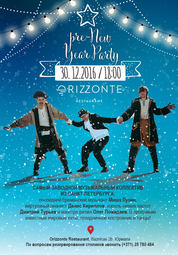30 декабря в 18:00 юрмальский ресторан Orizzonte приглашает в ностальгической атмосфере подготовиться к встрече Нового года. В гости к рижской и юрмальской публике приезжает музыкальный ансамбль, собравший артистов от Санкт-Петербурга до Владивостока: последний „бременский музыкант” Миша Лузин, виртуозный пианист Денис Кириллов, король низких частот Дмитрий Турьев и маэстро ритма Олег Пожидаев.