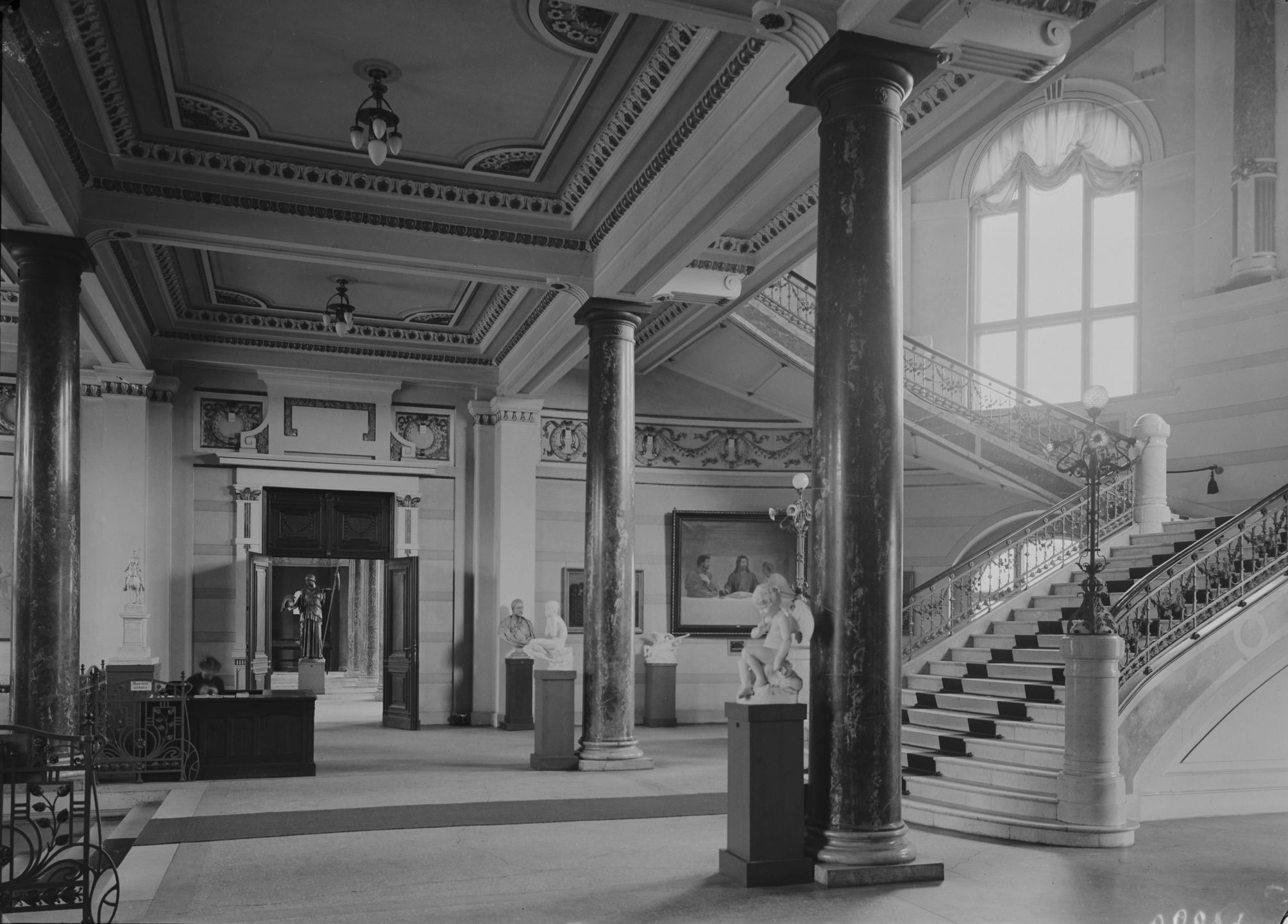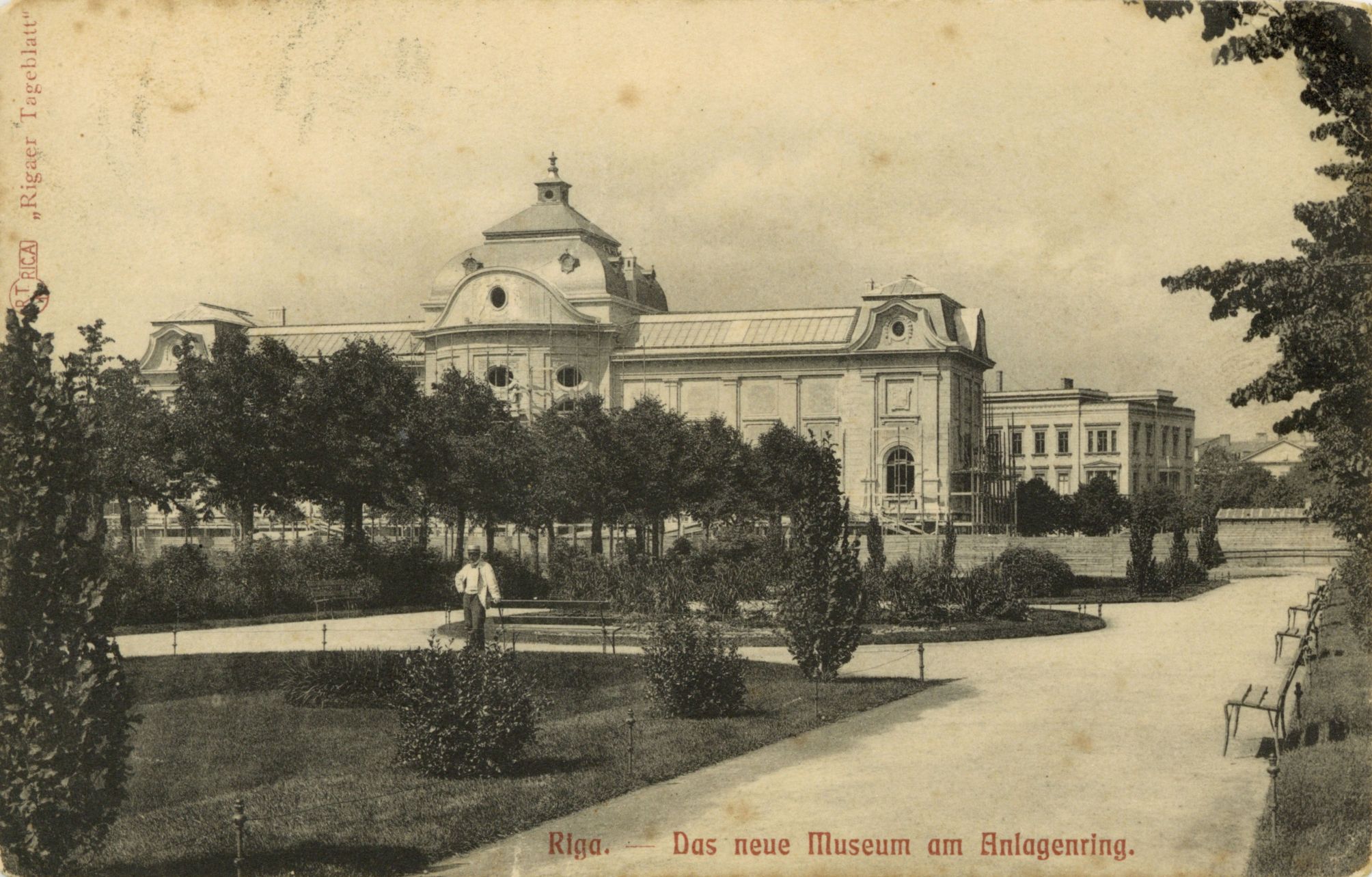 Здание музея было спроектировано архитектором и искусствоведом Вильгельмом Нейманом (1849–1919), который также стал первым директором Рижского городского художественного музея и занимал эту должность до начала 1919 года, когда его сменил художник Вильхелмс Пурвитис, ознаменовав начало нового этапа в развитии учреждения. Хотя изначально музей носил название «Рижский городской», первый директор с самого начала стремился к более широкому масштабу. Это символически отразилось в заказанных произведениях искусства — шести монументальных полотнах для вестибюля верхнего этажа, написанных пейзажистами Вильхелмсом Пурвитисом и Герхардом фон Розеном, изображающих городские и сельские сцены из Видземе, Курземе и Эстонии.