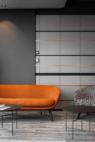 Типичная для компании сфера деятельности, вестибюль офиса также может быть адаптирован к потребностям бара во время общественных мероприятий. Помимо удобных и хорошо продуманных рабочих мест, есть также отдельные зоны отдыха, где вы можете уединиться, чтобы, например, поговорить по телефону, задуматься в тишине над созданием письма или над новой идей, погрузившись в акустические кресла. В офисе есть три конференц-зала для больших и малых собраний, а также несколько рабочих мест открытого типа.