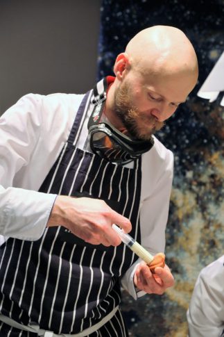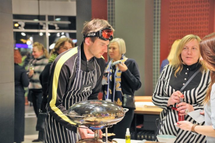 Неизменный повар всего, что организует Krassky, Мартиньш Ритиньш, и тот не обошел ни в своем наряде, ни в приготовленных им закусках олимпийскую тему. Был и «допинг» (в кап-кейки вкалывали крем), и олимпийские кольца (жаренные кольца луку в приправах разного цвета), и олимпийский огонь, на котором можно было поджарить сосиски… Да и много другое. О каждом блюде Мартиньш предварительно рассказал, подсвечивая блюда тем самым знаменитым факелом.