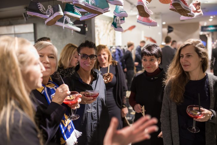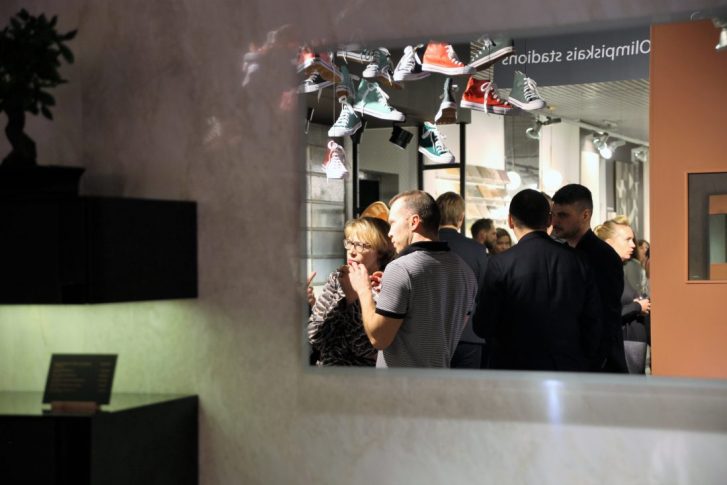 Темой последнего мероприятия стали… Олимпийские игры. Поэтому гостей просили явиться в удобной спортивной обуви. Впрочем, те, кто не успел после работы сменить одежду, кеды выдавались прямо на входе. Только подними руку и срежь понравившуюся обувку. Даже в лекции была обыграна спортивная тема: каждый сотрудник компании представлял тот или иной вид спорта, что и демонстрировал (на экране), рассказывая о своем отделе/секции/продукции/бренде.