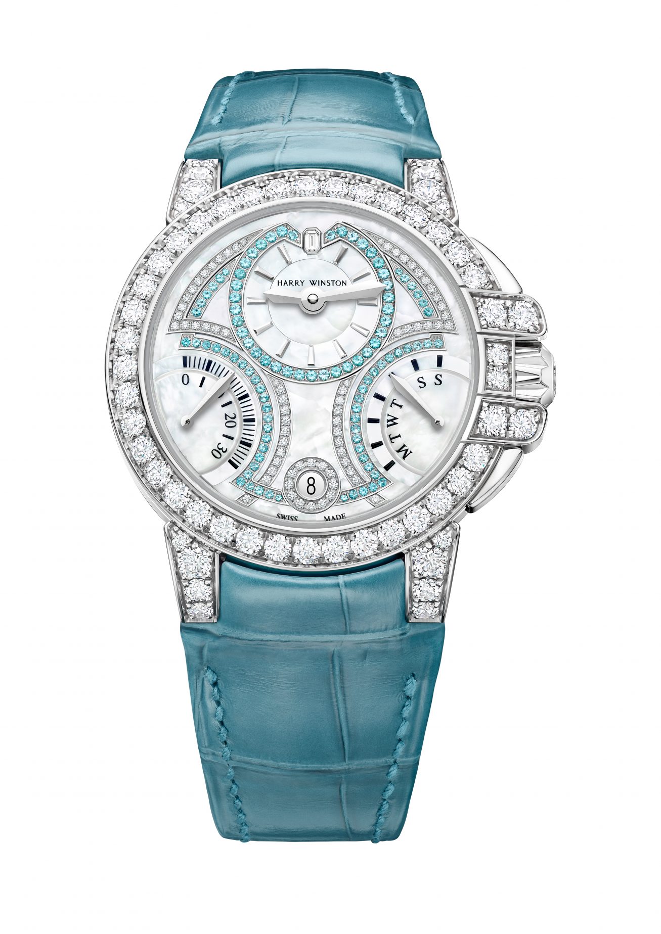 В этом году Дом Harry Winston погружается в море ярких красок и представляет новейшую часовую модель Ocean, которая инкрустирована по меньшей мере 97 турмалином Параиба. Турмалины Параиба, украшающие циферблат Ocean 20th Anniversary Biretrograde Automatic 36мм, были отобраны за свой насыщенный цвет и необыкновенное сияние. Они ассоциируются с переменчивыми оттенками тропического Карибского моря и придают дизайну часов нотку поистине райской безмятежности.