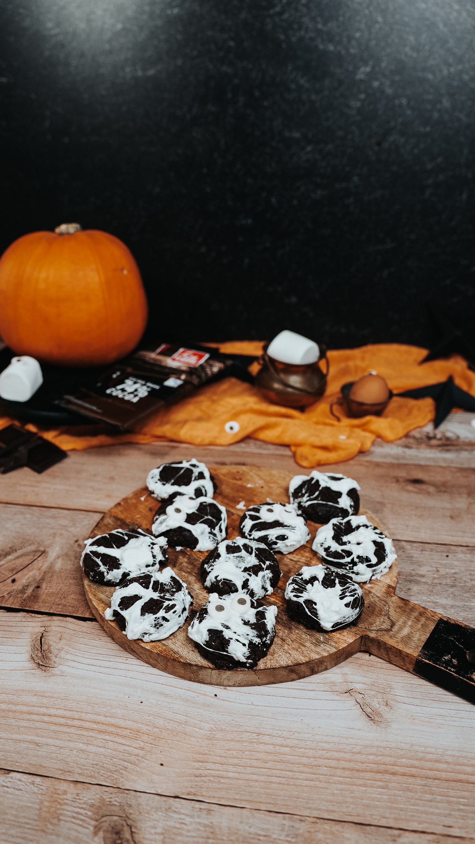 Ингредиенты (на 10 печений): 175 г тёмного шоколада (не менее 52 %), 75 г белого сахара, 50 г тростникового, 70 г муки, 50 г сливочного масла, 20 г какао, 2 яйца, ½ ч. л. разрыхлителя, щепотка соли, 5–6 зефиров (маршмеллоу), декор «глазки».