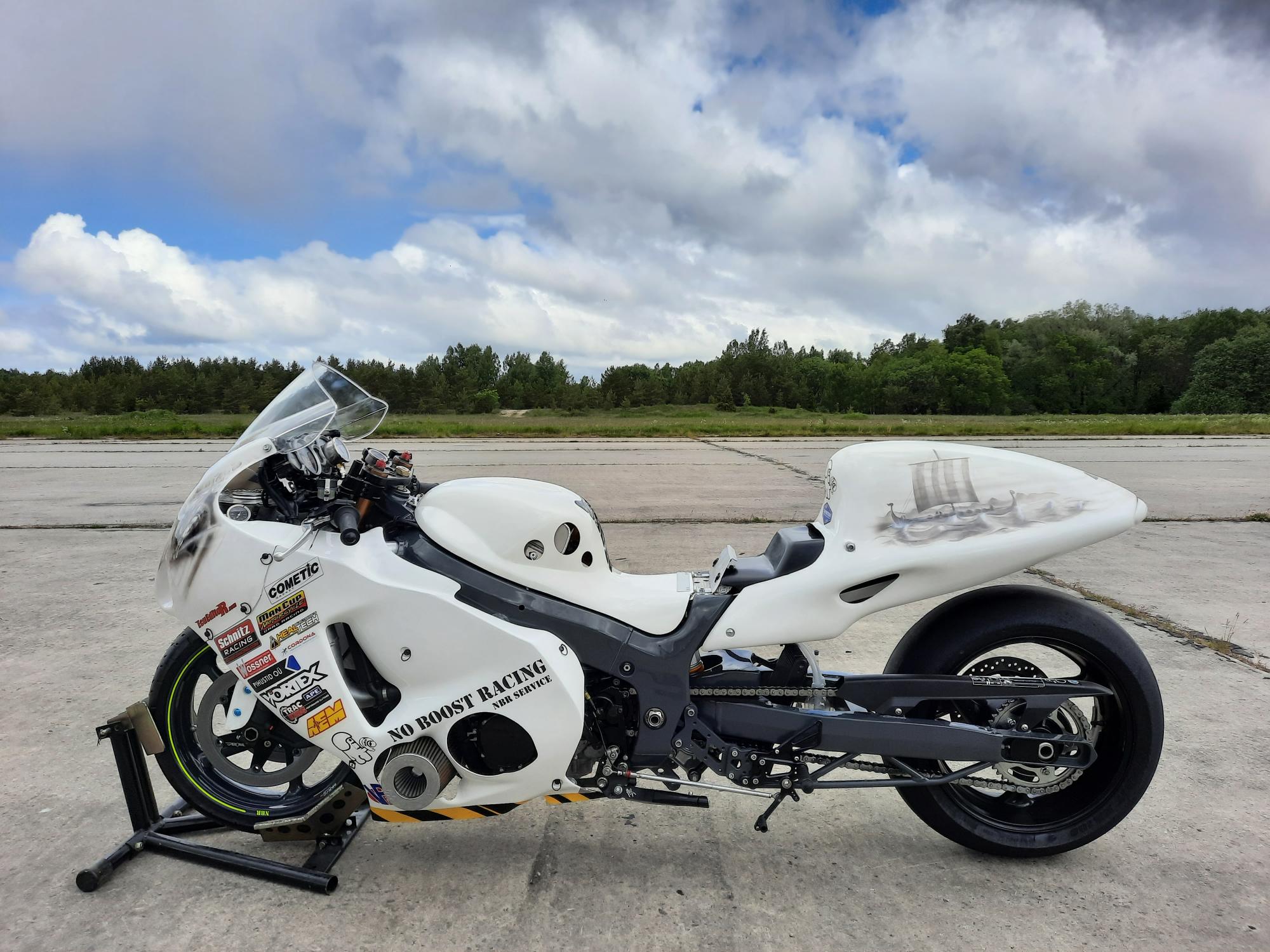 Еще один участвующий в выставке драгстер создан на базе самого быстрого серийного мотоцикла мира “Suzuki Hayabusa” и назван “Белым викингом”. Практически все детали полностью переделаны или заменены, а сам проект отшлифован так, что мощность увеличена более чем втрое в сравнении с заводским мотоциклом – 505 лошадиных сил. Это почти столько же как, например, у “BMW M4 Competition”. 402-метровую дистанцию драг-рейсинга “Белый викинг” пролетает за 8,9 секунды, превосходя даже 1600-сильный “Bugatti Chiron Super Sport”, которому на это требуется 9,1 секунды.