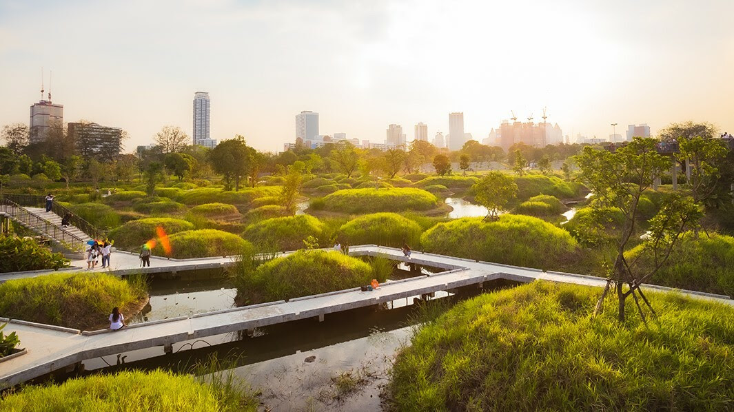 Частный проект с ярко выраженной природной концепцией. Здесь восстановлена пойменная экосистема — участок, который периодически затапливается и создаёт идеальные условия для редких растений и животных, некогда обитавших на территории будущего Бангкока. Парк создан не для пробежек, а для созерцательных прогулок. Смотровая площадка позволяет увидеть реконструированный природный ландшафт с высоты и ощутить масштаб работы, проделанной для восстановления экосистемы.