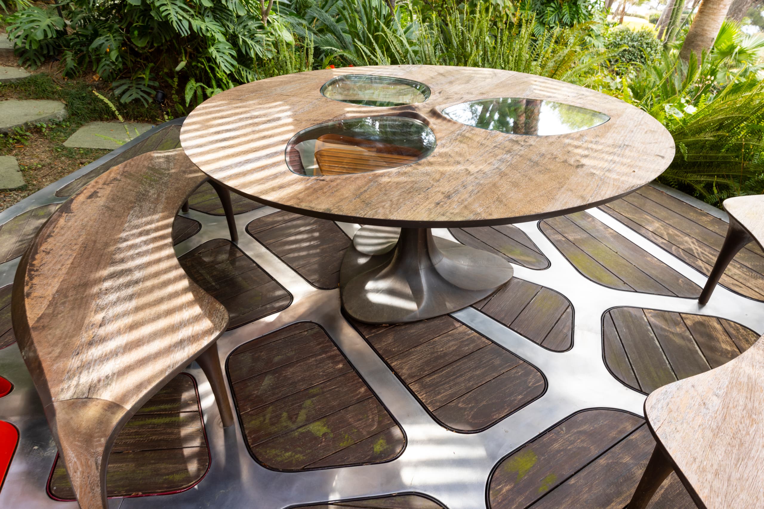 Концепция павильона строится вокруг биоморфной формы, напоминающей раковину. Конструкция объединяет стальное основание площадью около 20 квадратных метров и деревянные элементы из американского дуба. В комплект входят три скамьи и стол, выполненные в той же эстетике и материале, что превращает объект в завершённое пространство для жизни, а не просто архитектурный жест.