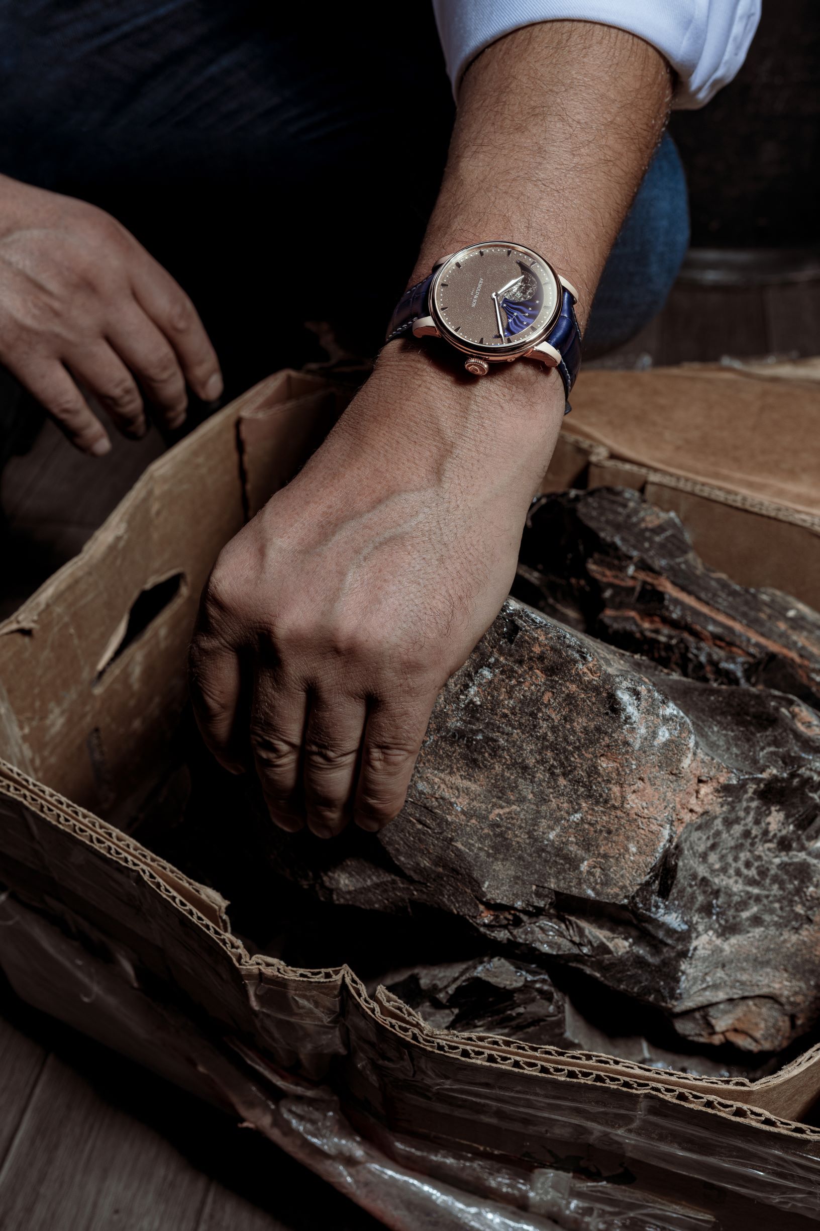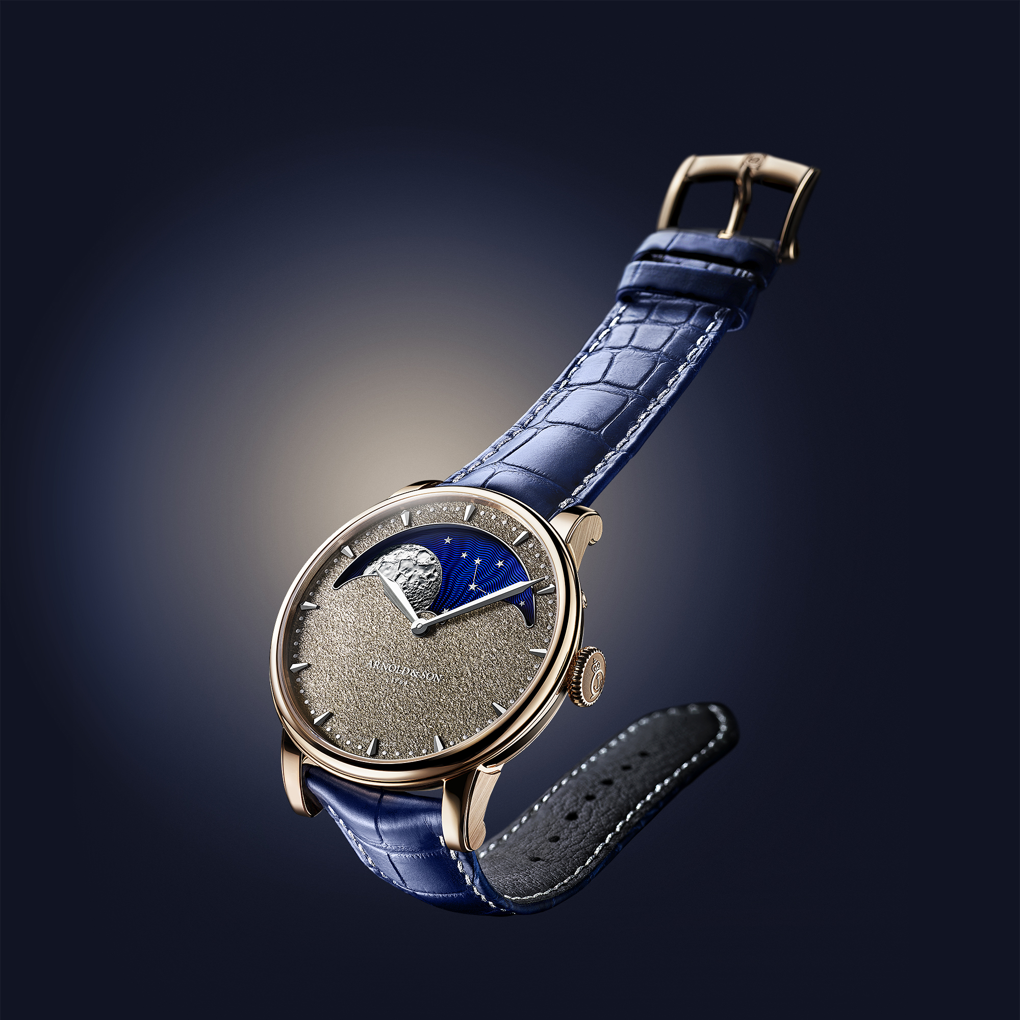 Arnold & Son подобрали прохладные оттенки, чтобы контрастировать с камнем. Луна и стрелки имеют родиевое покрытие, а часовые метки изготовлены из полированного бриллиантами белого золота. Вместе все это усиливает отражение золотого обсидиана и красного золота на корпусе. Завершая контрастное сочетание теплых и прохладных тонов, бренд выбрал синий ремешок из кожи аллигатора с видимой строчкой серебристого цвета