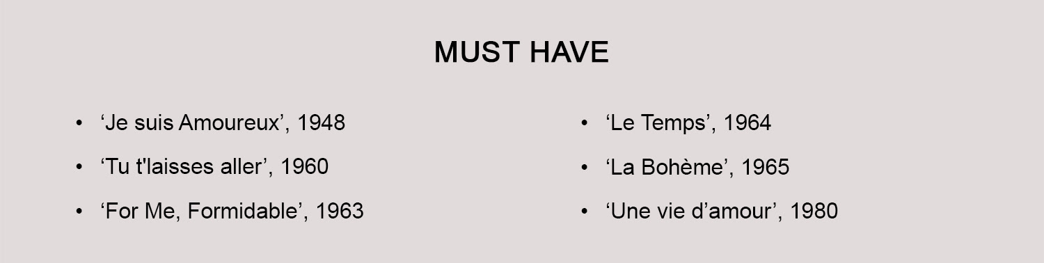 В 1963 году Азнавур пишет композицию «For me… formidable», а год спустя – «Le temps», которая позже станет саундтреком к фильму «Квартира» 1996 года с Моникой Белуччи и Венсаном Касселем – считается, что именно эта картина принесла французско-итальянской певице известность.