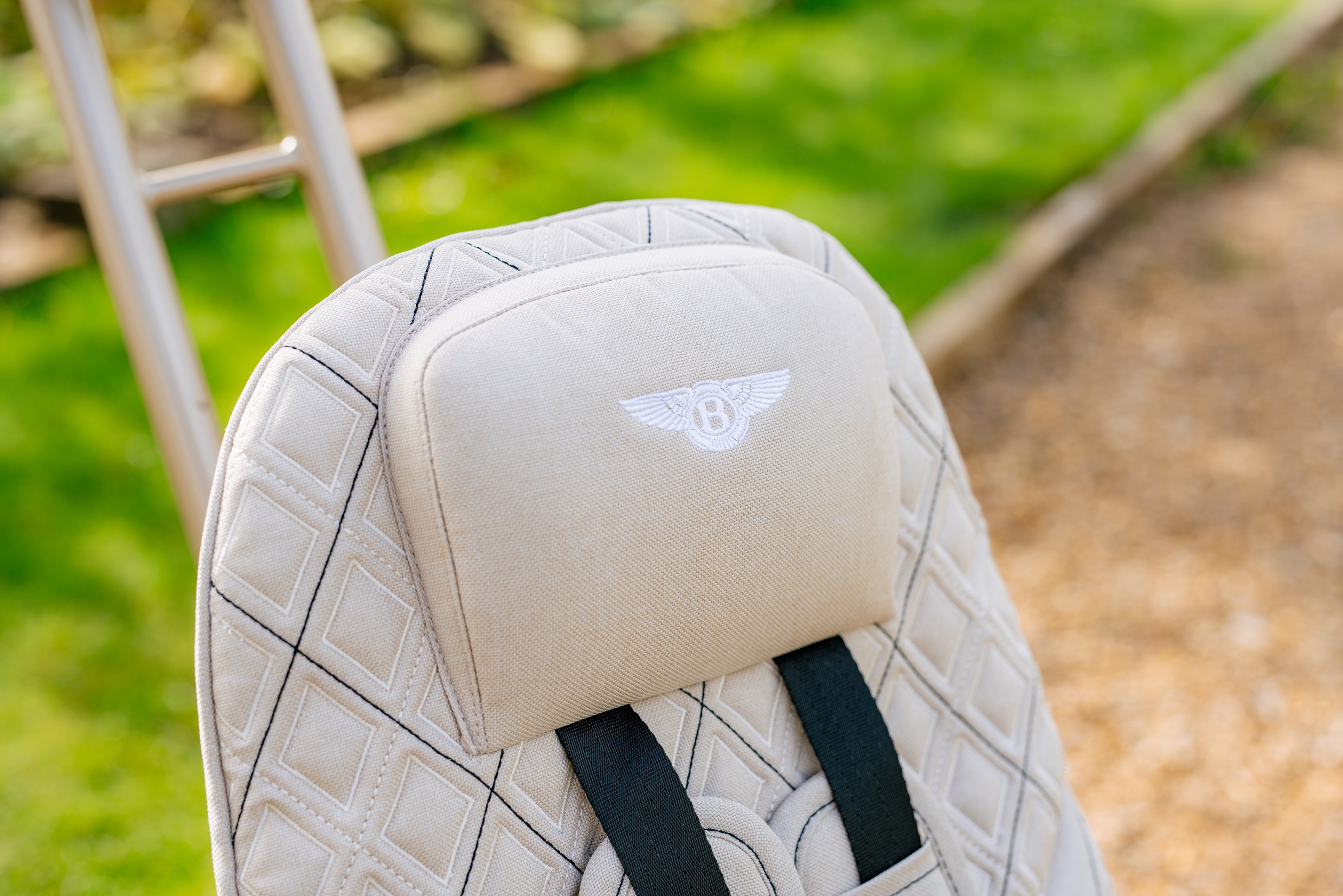 Mulliner, ручное стежка «алмаз в алмазе», а бэйдж Bentley вышит на мягкой подголовнике. Велосипедные колеса с надувными шинами повторяют дизайн колес Mulliner вплоть до логотипа Bentley посередине, окруженного словами «Bentley Mulliner» — так же, как на колесах оригинального автомобиля Mulliner. Крышка центральной части колеса обеспечивает вертикальное положение буквы «B» даже при движении велосипеда.