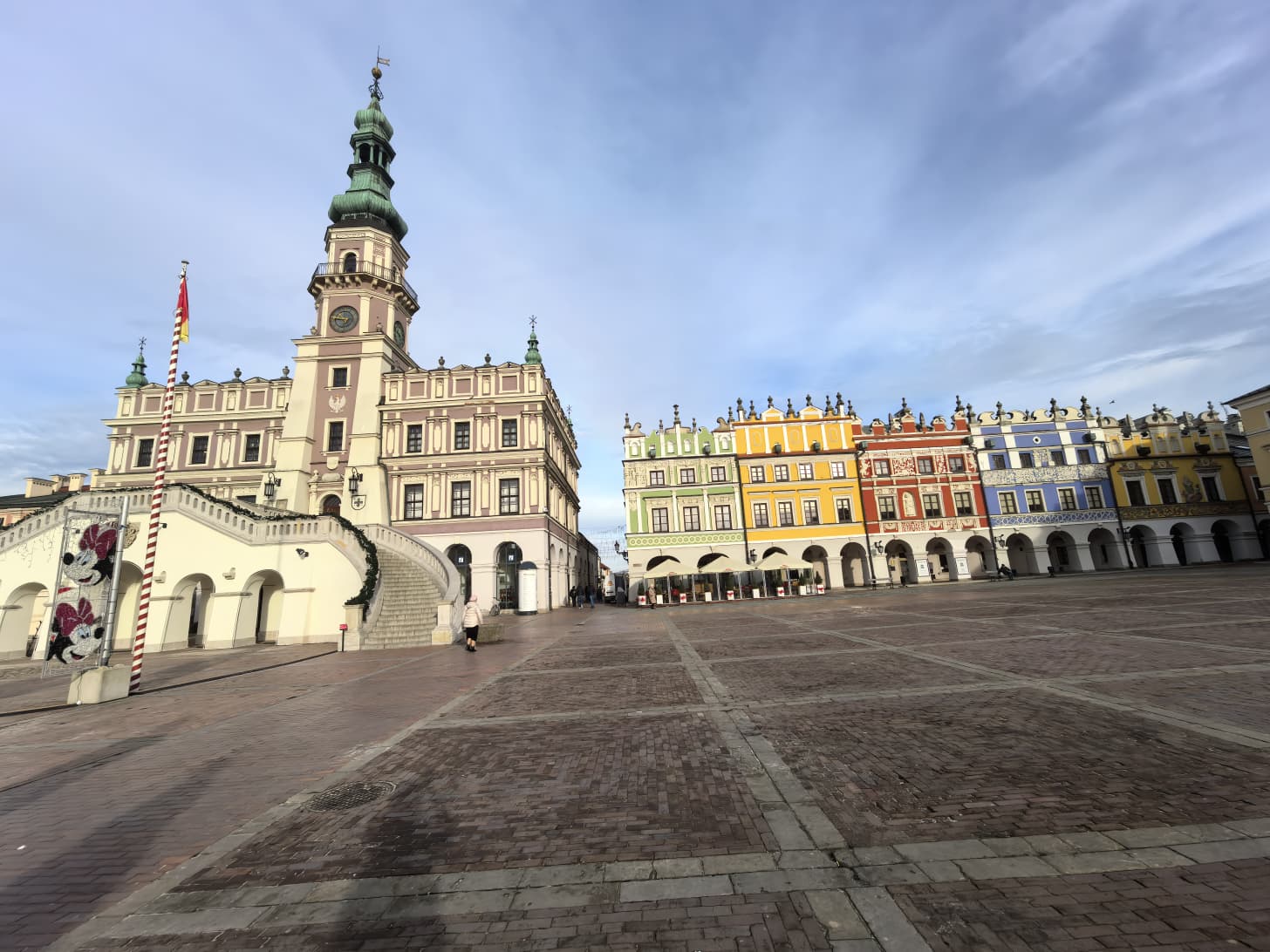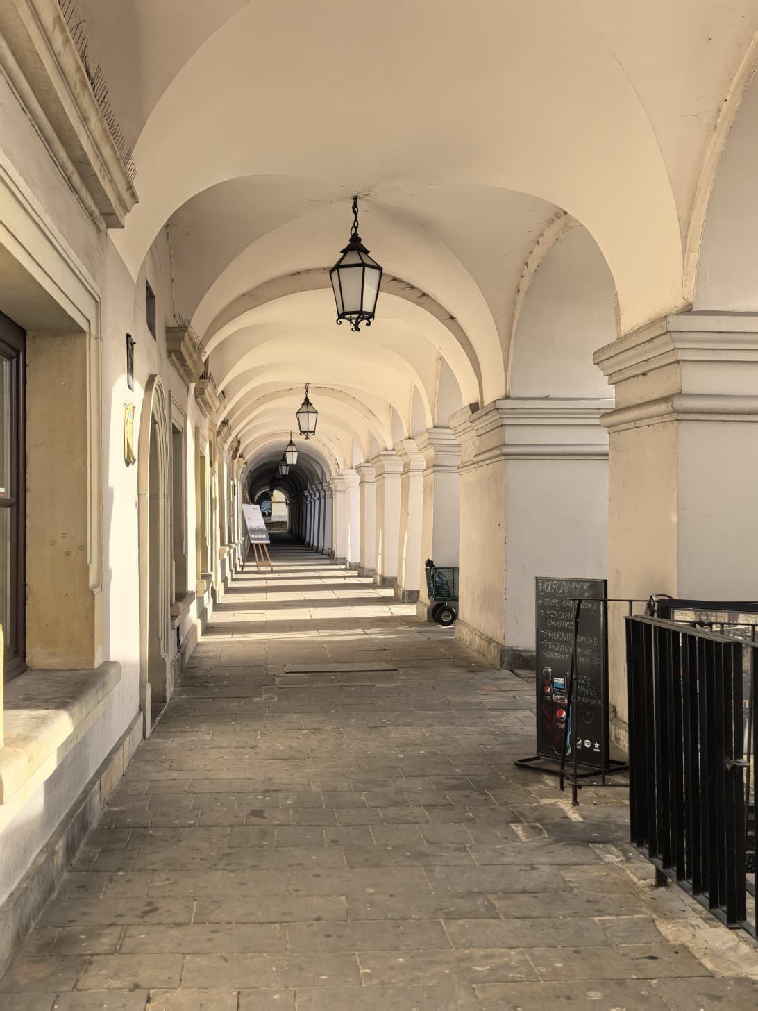 На этом фоне становится особенно заметным сам характер площади. Rynek Wielki, так называется сама площадь, воспринимается сразу как собранное и уравновешенное пространство: строгий ритм фасадов, чётко выстроенные перспективы, отсутствие визуального шума. И есть ещё одна принципиальная особенность — вся площадь окружена аркадами. А еще Замосць не случайно называют городом аркад. По периметру Rynek Wielki можно пройти полностью, не выходя под дождь или под палящее солнце. Как в Италии. Для Польши это редкость. И снова речь идёт не о декоративном эффекте, а о продуманной городской среде, где архитектура работает на человека. И снова речь идёт не о декоративном эффекте, а о продуманной городской среде, где архитектура работает на человека и становится частью его повседневного маршрута.