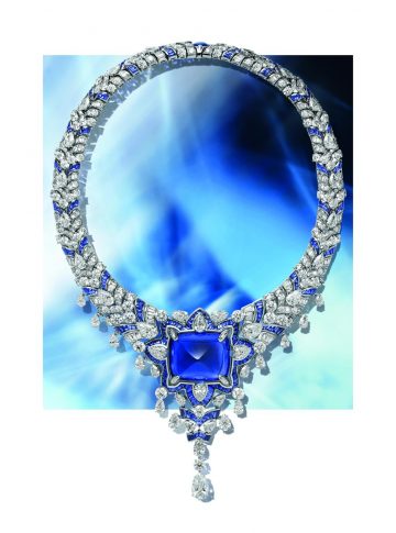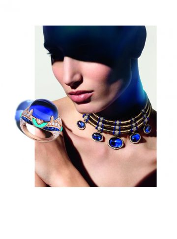 Восхищение созвездиями на небосводе и куполами на линии легендарного римского горизонта вдохновило креативного директора Лючию Сильвестри на создание колье Bvlgari Cosmic Vault — гимна астральной красоте и архитектурному величию. Это завораживающее творение, в котором органично сочетаются божественный символизм и архитектурное великолепие, украшено шриланкийским сапфиром «сахарная голова» в 123,35 карат глубокого и насыщенного королевского синего оттенка, который мгновенно напоминает о 66-каратном драгоценном камне в культовом ожерелье, созданном для Элизабет Тейлор. Огранка «сахарная голова» придает ощущение невероятной мягкости и изогнутости, а также бархатистой текстуры, что идеально сочетается со сложной, но гибкой структурой украшения, делающей его удобным. Чередующее более 200 элементов, колье украшено 331 сапфиром огранки buff-top, тонко выстроенными по особым оттенкам синего, а также 13 бриллиантовыми каплями, которые вместе задают исключительно эстетичную и легкую хореографию.