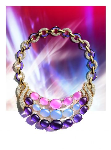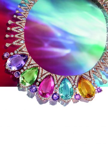 Polychromatic Bloom — ода красоте и женственности, наполняет безграничной радостью жизни. По словам креативного директора Лючии Сильвестри, это яркое творение — “одна из эмблем Polychroma”. Созданное из более чем 500 частей, колье отражает акцент коллекции на смелых цветовых сочетаниях и элегантных объемах. Всё внимание на три высококлассных драгоценных камня: центральный рубеллит 106,36 карат соседствует с перидотом 55,52 карат и танзанитом 55,11 карат, выбор огранки кабошон для невероятного трио подчеркивает дерзкий дух Bvlgari. Оправленные в розовое золото, эти замечательные драгоценные камни с их необычайной прозрачностью и глубиной текучего цвета окружены лепестками, чья классическая прелесть уравновешена поразительной современностью графичной трехмерной цепочки. Союз природы и мастерства человека во имя великолепия.