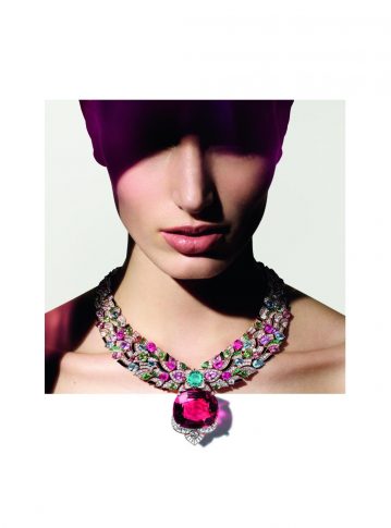 Передавая дух мультикультурности и разнообразия коллекции, радостная изящная гармония колье Bvlgari Celestial Mosaic навеяна мозаикой «Древо жизни» 18-го века в Иерихоне. Центральная шпинель из Таджикистана весом 131,21 карата, четвертая по величине в мире и первая по качеству, будто излучает целый калейдоскоп оттенков — от бирюзовой глубины редчайшего турмалина до мозаичного многоцветья изумрудов огранки buff top, ониксов и бриллиантов. Чувствуется влияние искусства Великих Моголов. Потрясающее украшение состоит из почти 200 элементов, которые собраны мастерски выполненными гибкими соединениями, гарантирующими идеальную посадку. Смелость и изящество вне времени переплелись в этом колье, полном райского очарования.