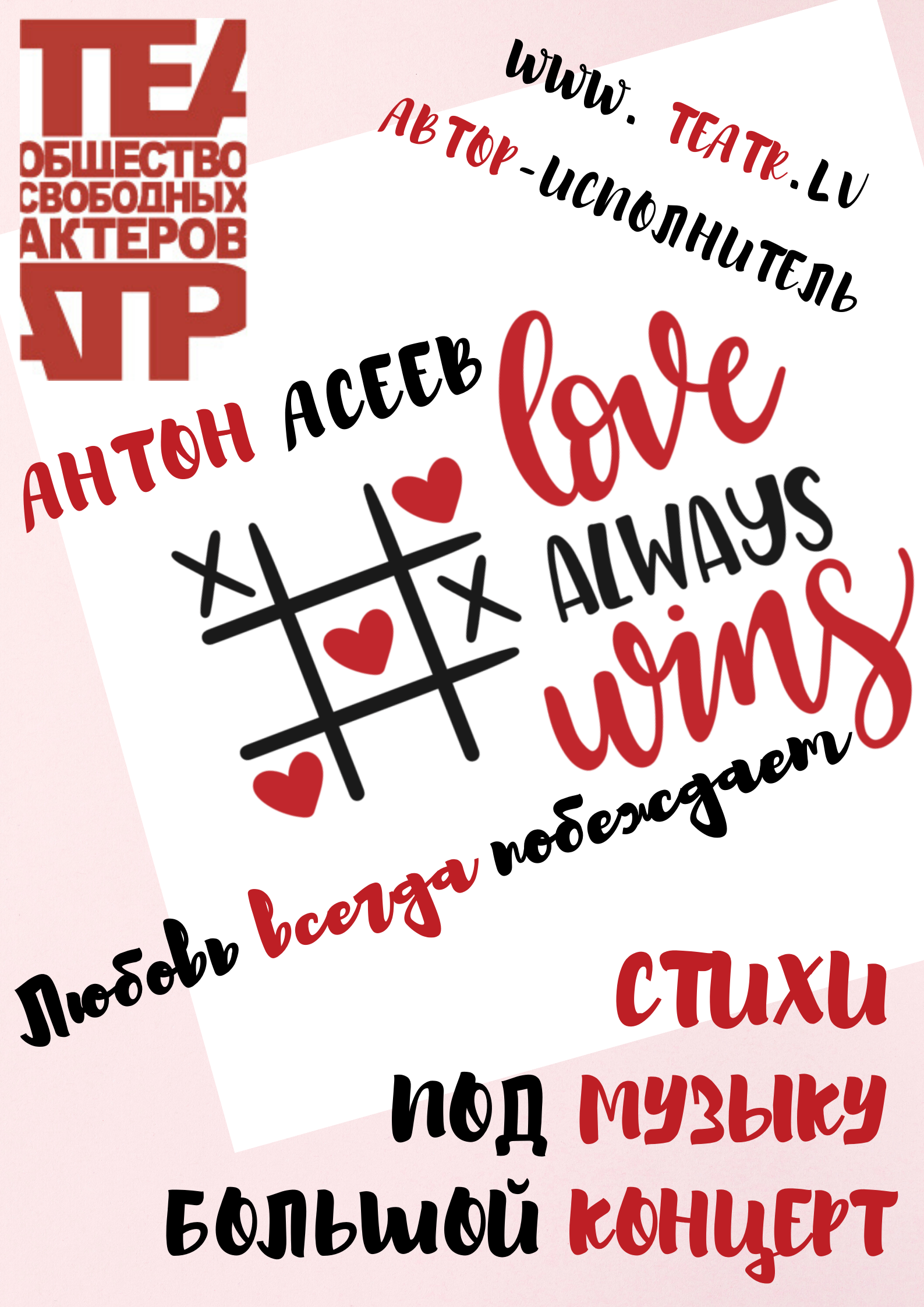 15 октября в стенах театра «Общество свободных актёров» пройдёт большой поэтический концерт под названием «Любовь всегда побеждает», состоящий из стихов молодого поэта-современника Антона Асеева, которые автор будет читать под музыку. В программе — 25 стихотворений, объединенных темой «Любовь». Любовь как фундамент жизни, любовь во всех её проявлениях.