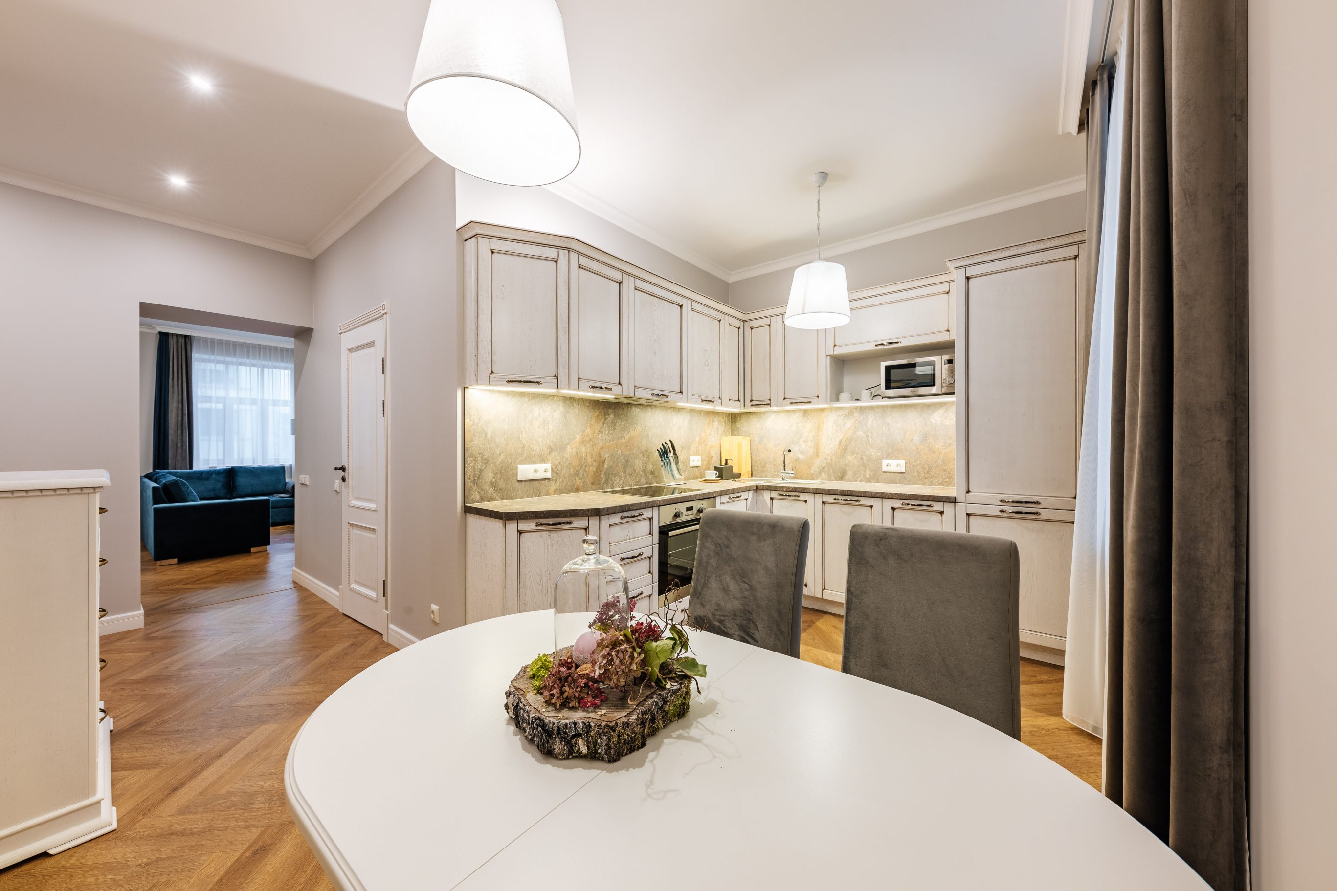 Самая распространенная планировка в Residence Pērnavas 41 — двухкомнатные апартаменты. Их 33, площади начинаются от 48 кв. метров. Именно они пользуются наибольшим спросом у постояльцев с момента открытия комплекса, что произошло осенью 2022 года. 20 других апартаментов — трехкомнатные. Элитное предложение — это четыре четырехкомнатных пентхауса площадью 160, 126, 118 и 105 кв. метров.