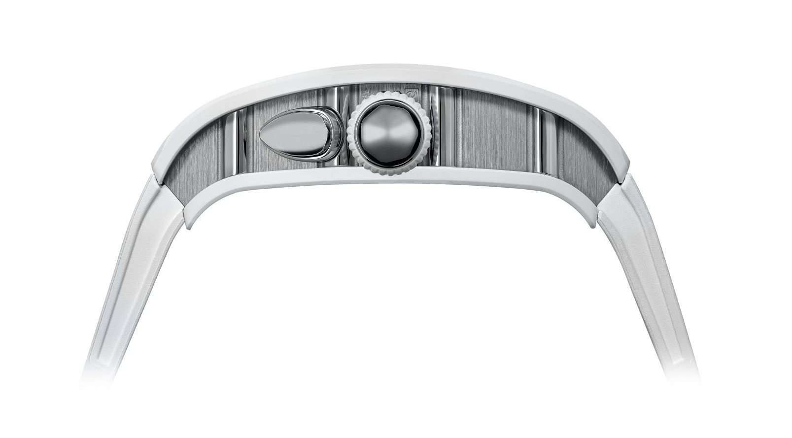 Эта модель безупречно белого цвета с чистыми линиями сохранила все технические преимущества серии, начиная со скелетонизированного автоматического механизма собственного производства. Плата и мосты изготовлены из титана Grade 5 с черным PVD-покрытием, на отметке «12 часов» размещен крупный указатель даты, а у отметки «4 часа» находится селектор функций, позволяющий переключать режимы – завод (W), нейтральное положение (N) и ручная настройка (H), – не используя заводную головку. Две полированные кнопки из белого золота предназначены для настройки даты и запуска указанных выше функций. Запатентованная конструкция заводной головки особой сборки гарантирует безопасность механизма: она не соединена напрямую с механизмом, а является частью корпуса, что полностью исключает риск поломки. Архитектура механизма позволяет рассмотреть каждую деталь калибра Richard Mille CRMA1, в том числе ротор из красного золота с изменяемой геометрией, видимый через сапфировое стекло