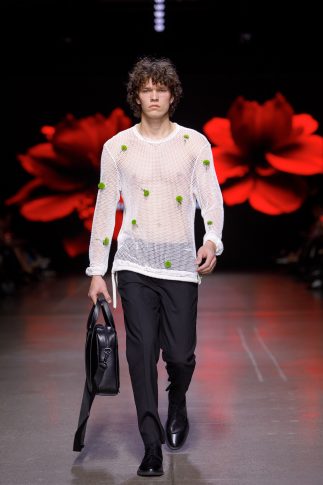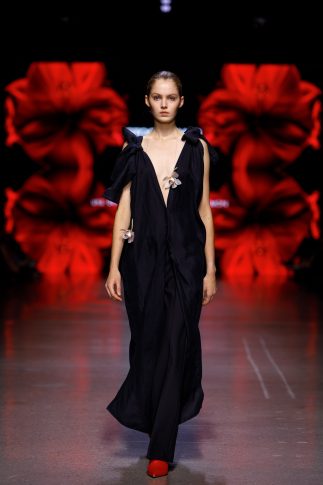 На показе мод с помощью искусственного интеллекта был сотворен сюрреалистический и сочный мир, который подарил радость своими богатыми и роскошными праздничными мазками, изобразив бурное цветение. Цветочная графика в виде выразительных деталей перекочевала с экранов и на представленные на показе наряды.