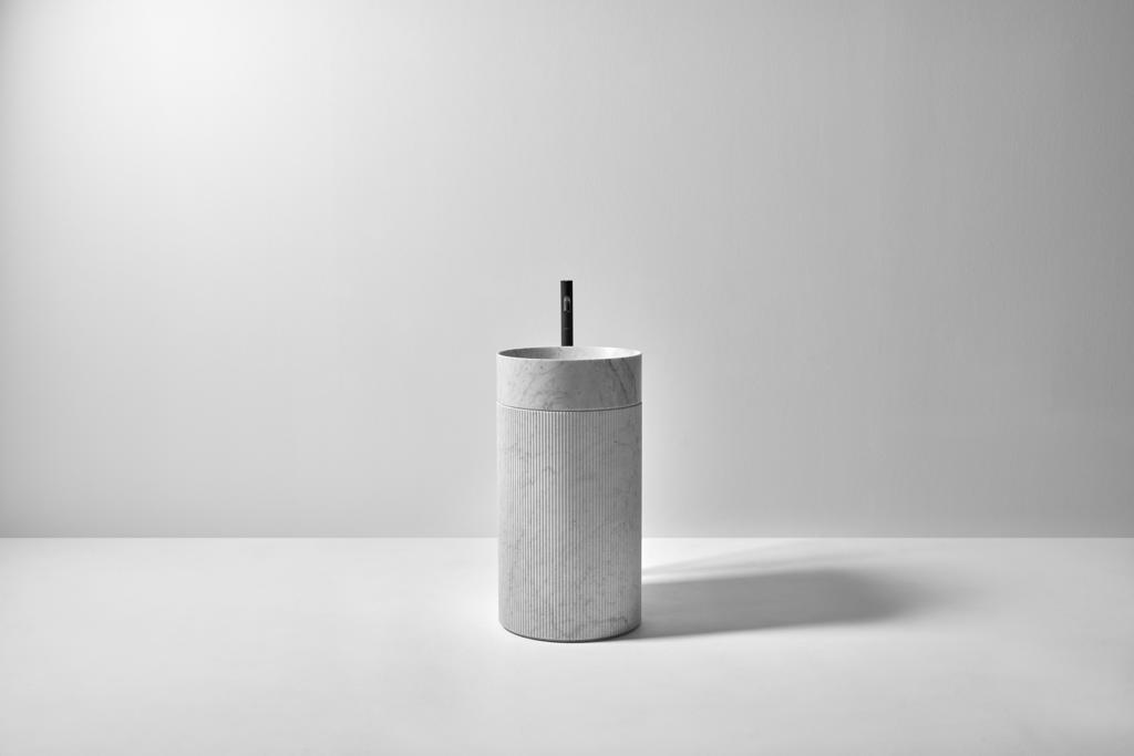 Умывальник задуман как модульный объект, способный органично вписаться в разные интерьерные сценарии. Колонна может быть выполнена из массива дерева, придавая пространству теплоту и тактильную насыщенность, либо из камня и мрамора — для более скульптурного и монументального эффекта. Чаша, установленная сверху, расширяет выразительные возможности модели: помимо натурального камня, она доступна в фирменных материалах Flumood и Colormood с однородной матовой поверхностью, подчёркивающей чистоту объёма.