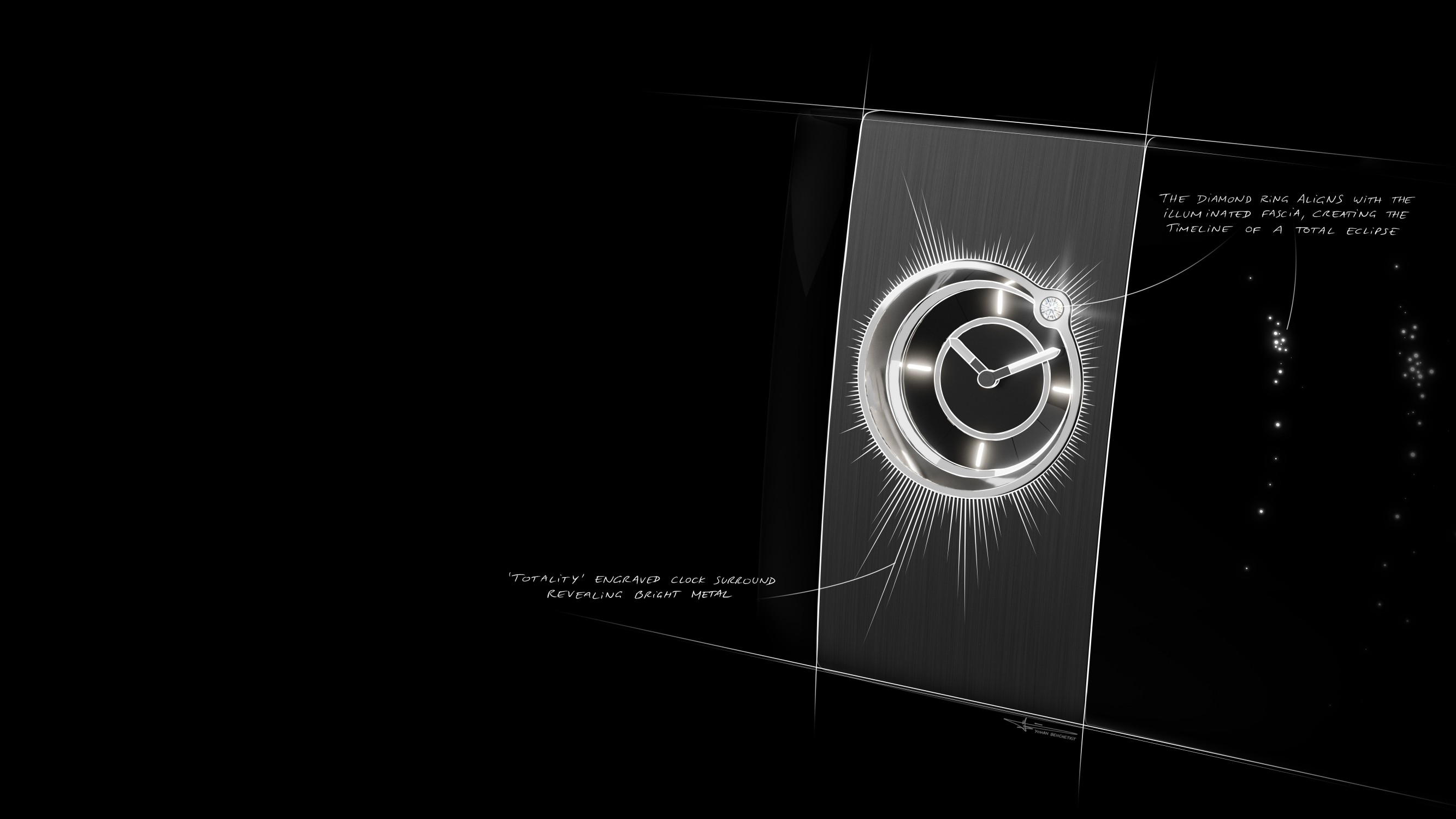 Кульминация композиции – уникальные часы, украшенные бриллиантом классической огранки весом 0,5 карата. Дизайн часов обыгрывает эффект «бриллиантового кольца», который можно наблюдать за мгновение до начала полной фазы солнечного затмения либо сразу после её окончания. Тогда вокруг Луны, затмившей собой Солнце, появляется тонкий круг солнечного света, резко усиливающийся в одной точке, откуда начинает пробиваться ослепительный луч света.