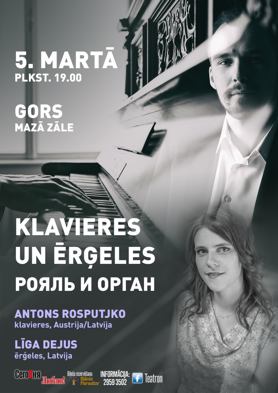 Два прекрасных музыканта, пианист Антон Роспутько (Австрия/Латвия) и органистка Лига Деюс (Латвия) впервые в Латвии представят публике программу, подготовленную специально для этого концерта. У слушателей будет возможность услышать произведения, написанные специально для дуэта фортепиано и органа, затем каждый из музыкантов исполнит несколько произведений соло для того, чтобы напомнить слушателям возможности и звучание каждого из инструментов и, наконец прозвучат переложения для органа и фортепиано.